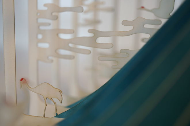 ページを一枚一枚レーザーカットして、360°開くと立体ジオラマが現れる絵本「360°Book」。雄大な富士山、雲そして鶴たちが日本の美を醸し出します。