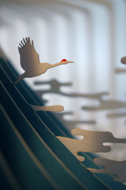ページを一枚一枚レーザーカットして、360°開くと立体ジオラマが現れる絵本「360°Book」。雄大な富士山、雲そして鶴たちが日本の美を醸し出します。