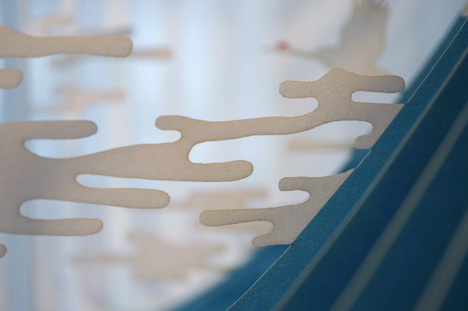ページを一枚一枚レーザーカットして、360°開くと立体ジオラマが現れる絵本「360°Book」。雄大な富士山、雲そして鶴たちが日本の美を醸し出します。