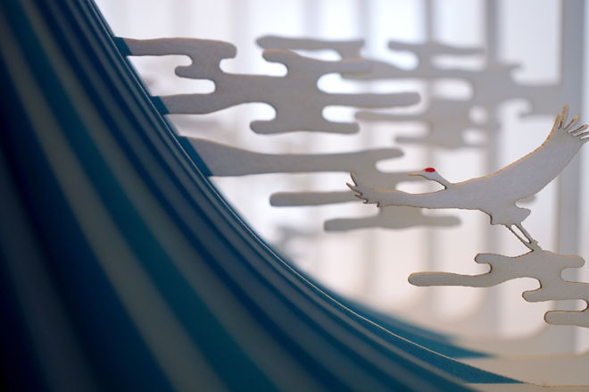 ページを一枚一枚レーザーカットして、360°開くと立体ジオラマが現れる絵本「360°Book」。雄大な富士山、雲そして鶴たちが日本の美を醸し出します。