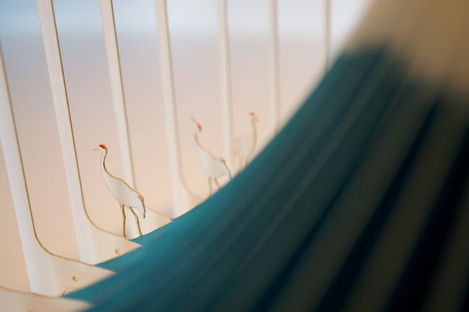 ページを一枚一枚レーザーカットして、360°開くと立体ジオラマが現れる絵本「360°Book」。雄大な富士山、雲そして鶴たちが日本の美を醸し出します。