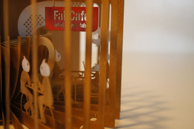 ページを一枚一枚レーザーカットして、360°開くと立体ジオラマが現れる絵本「360°Book」。大きなコーヒーカップを囲んだどこかのFabCafeでの日常が切り取られています。