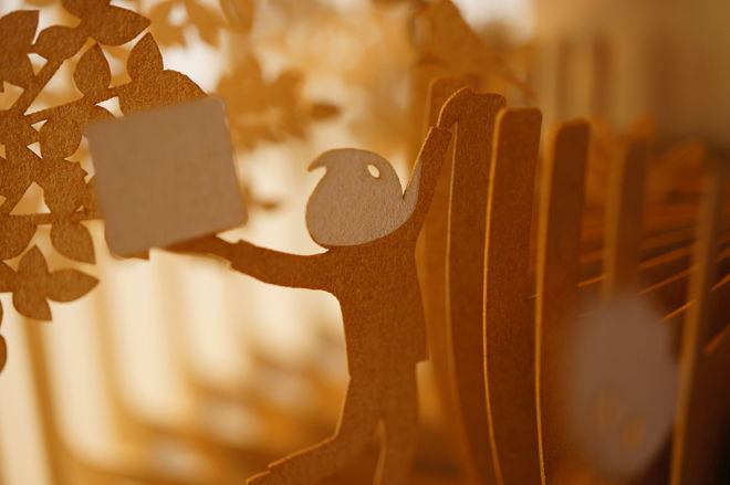 ページを一枚一枚レーザーカットして、360°開くと立体ジオラマが現れる絵本「360°Book」。大きなコーヒーカップを囲んだどこかのFabCafeでの日常が切り取られています。