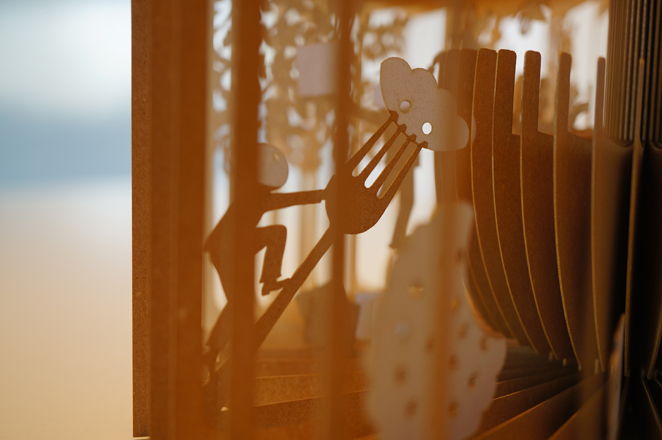 ページを一枚一枚レーザーカットして、360°開くと立体ジオラマが現れる絵本「360°Book」。大きなコーヒーカップを囲んだどこかのFabCafeでの日常が切り取られています。