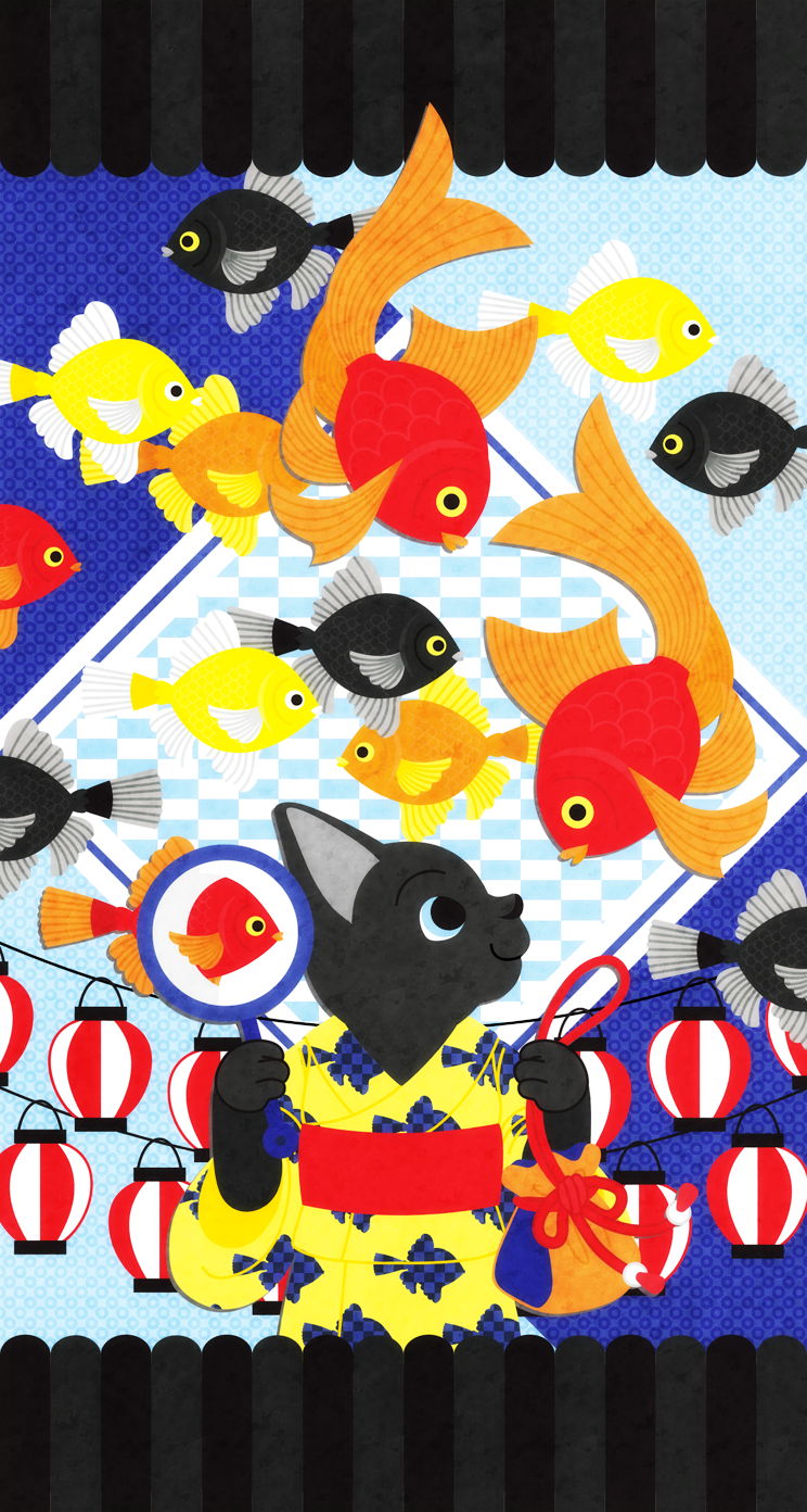 iPhonewallpaper,イラスト,デザイン,猫,かわいい,金魚,夏,夏祭り,動物,壁紙,