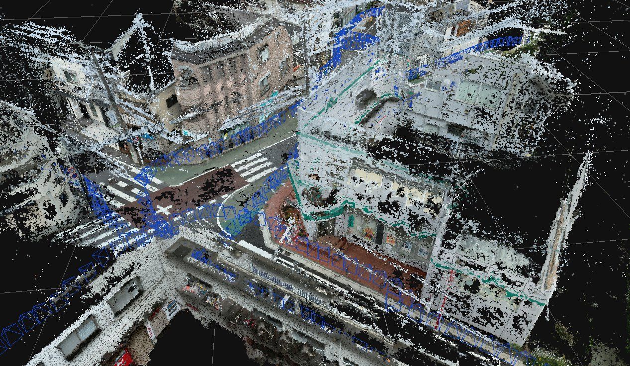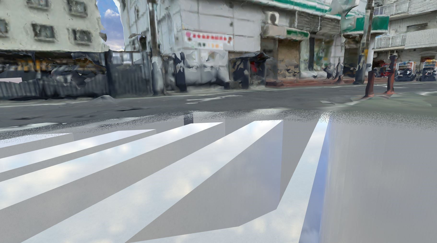 しかしフォトグラメトリによって再現された時間の流れていない街並みの中では、より自由で選択性の高い行動が可能となる。今回は世田谷砧のとある道路標示の錯綜した交差点を抽出した。