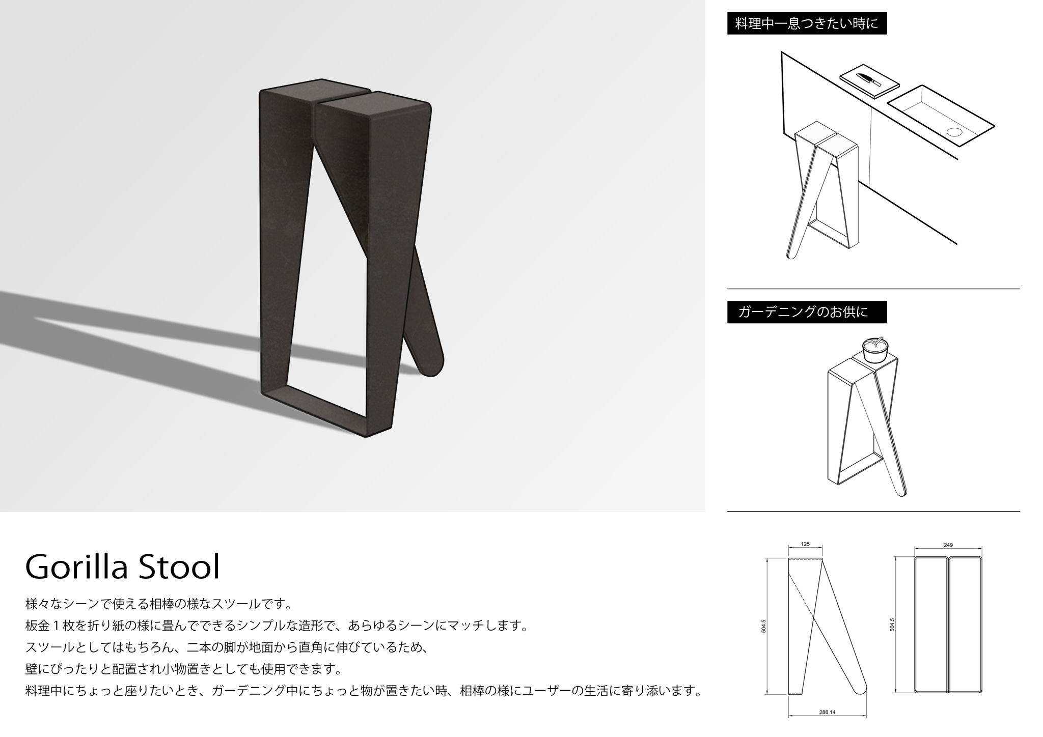板金1枚を折り紙のように畳んでできるシンプルな造形で、生活空間に然りげ無く溶けこむような佇まいを目指しました。