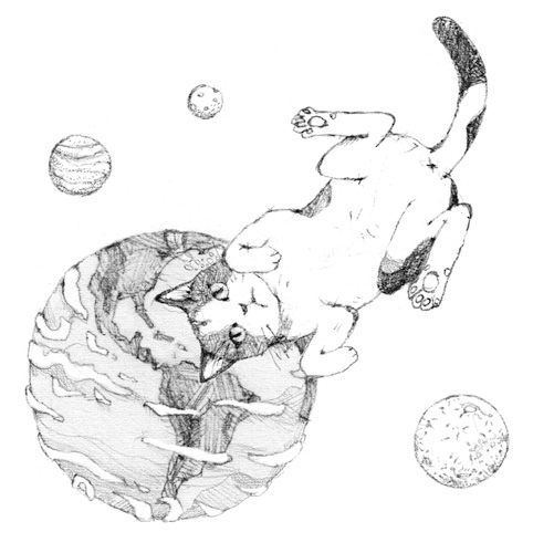 「ひらめきの物理学」扉絵 第13章「ネコの宙返りと回る地球」ドローイング