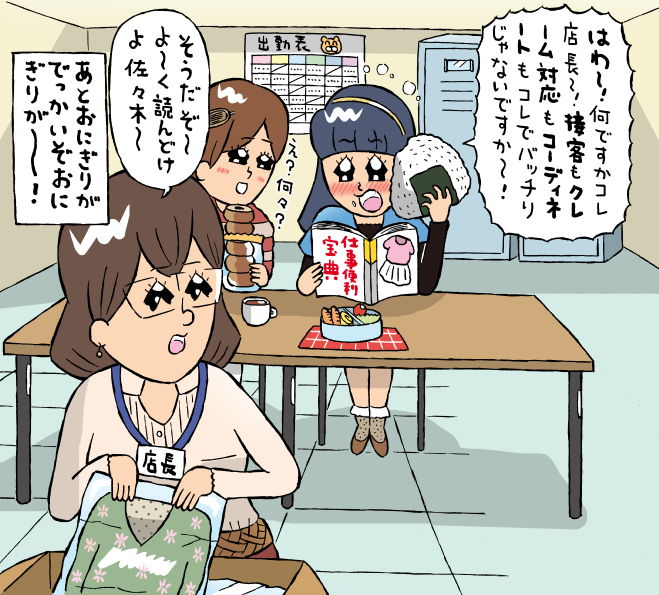 こちらもまた『ファッション販売』で描かせていただきましたイラストです。今年の6月号で『仕事便利宝典』というコーナーの扉絵でした。(フルカラー!)前にアップロードした4月号の時のイラストとキャラクターが一緒ですね。そうです、勝手に続編にさせていただきました(笑)おやおや?おにぎりがでっかいですよ?佐々木さん。(ちなみに右下の方がスッキリしているのは、そこに目次などの項目を入れるためにスッキリさせました。手抜きではありません。)