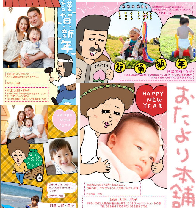 こちらは、おたより本舗というインターネットで年賀状を販売しているお店でデザインさせていただいた『写真入り年賀状』です☆10タイプほどデザインさせていただいたのですが、上の画像のようにお父さんバーションとお母さんバージョンでそれぞれ5バージョンずつ作成しました♪目を閉じているのは「昨年もいろいろあったなぁ」と思い出に浸っているような雰囲気を出したかったからですwこちらのサイトでまだ見れますので良かったら探してみてくださいね(^^)