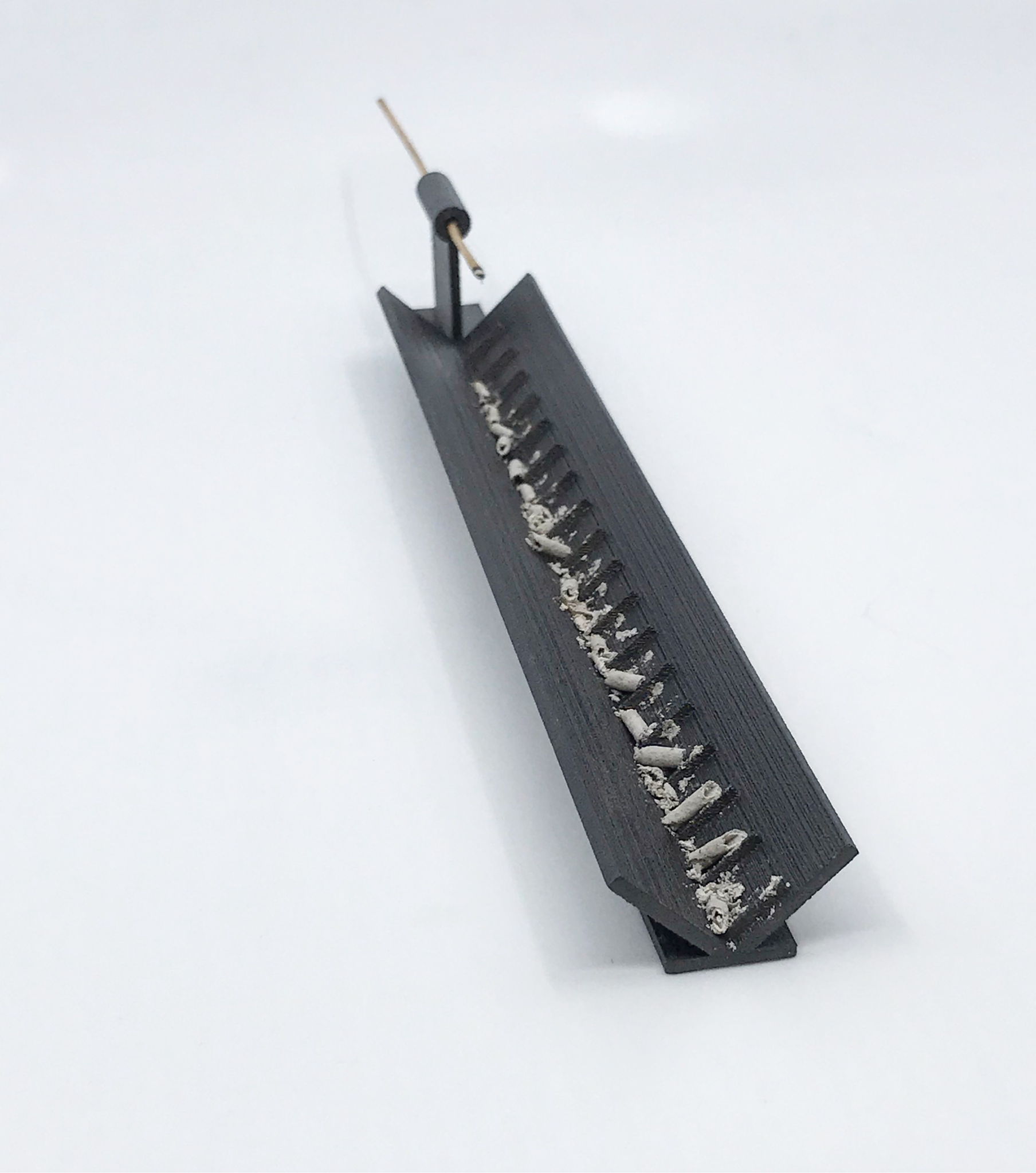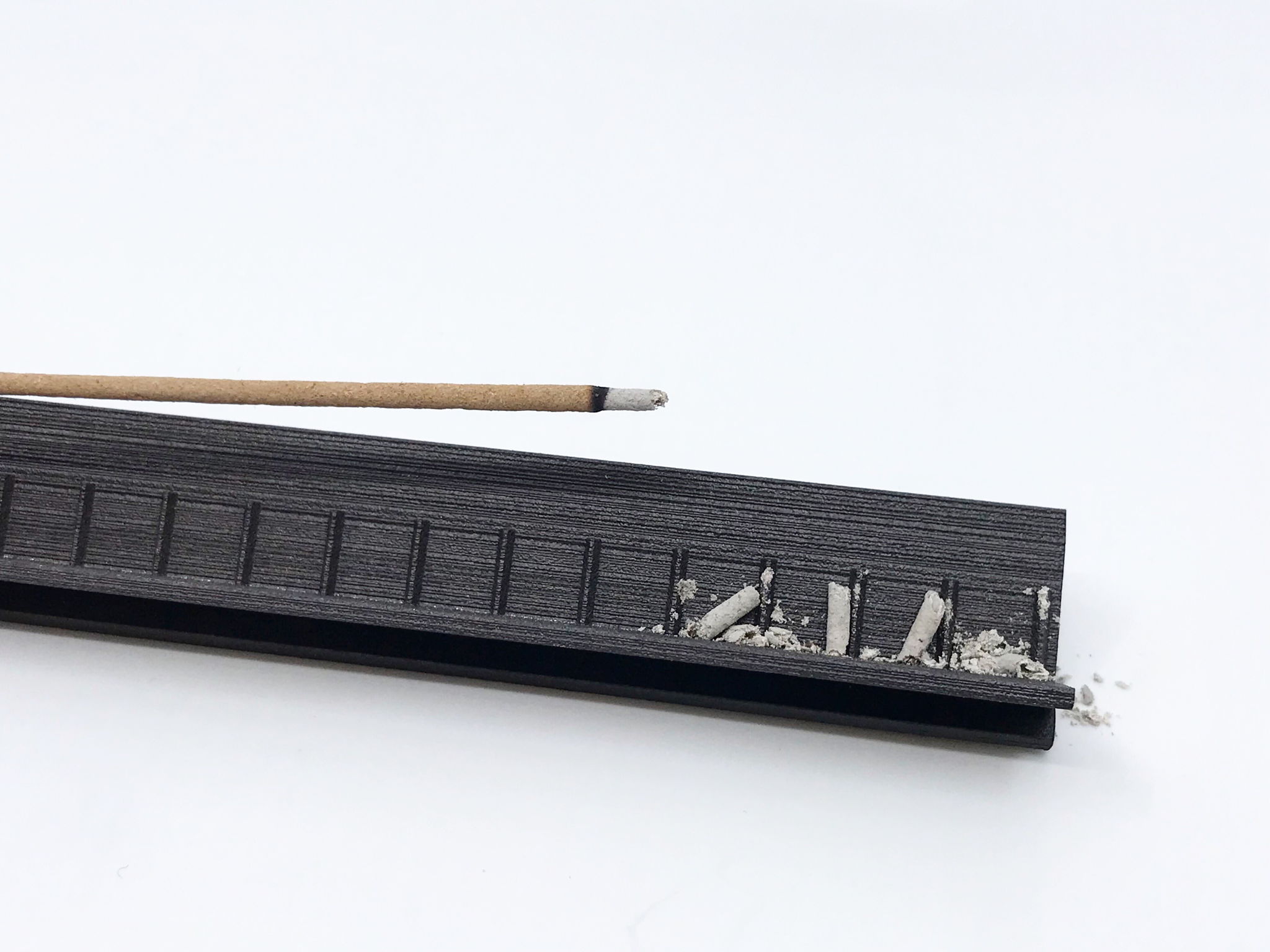 It uses an incense-stick as a timing device which, attached horizontally across a delineated tray, burns slowly at a constant pace (approximately two-minutes per segment), leaving a trail of ashes that indicate the passing of time.
