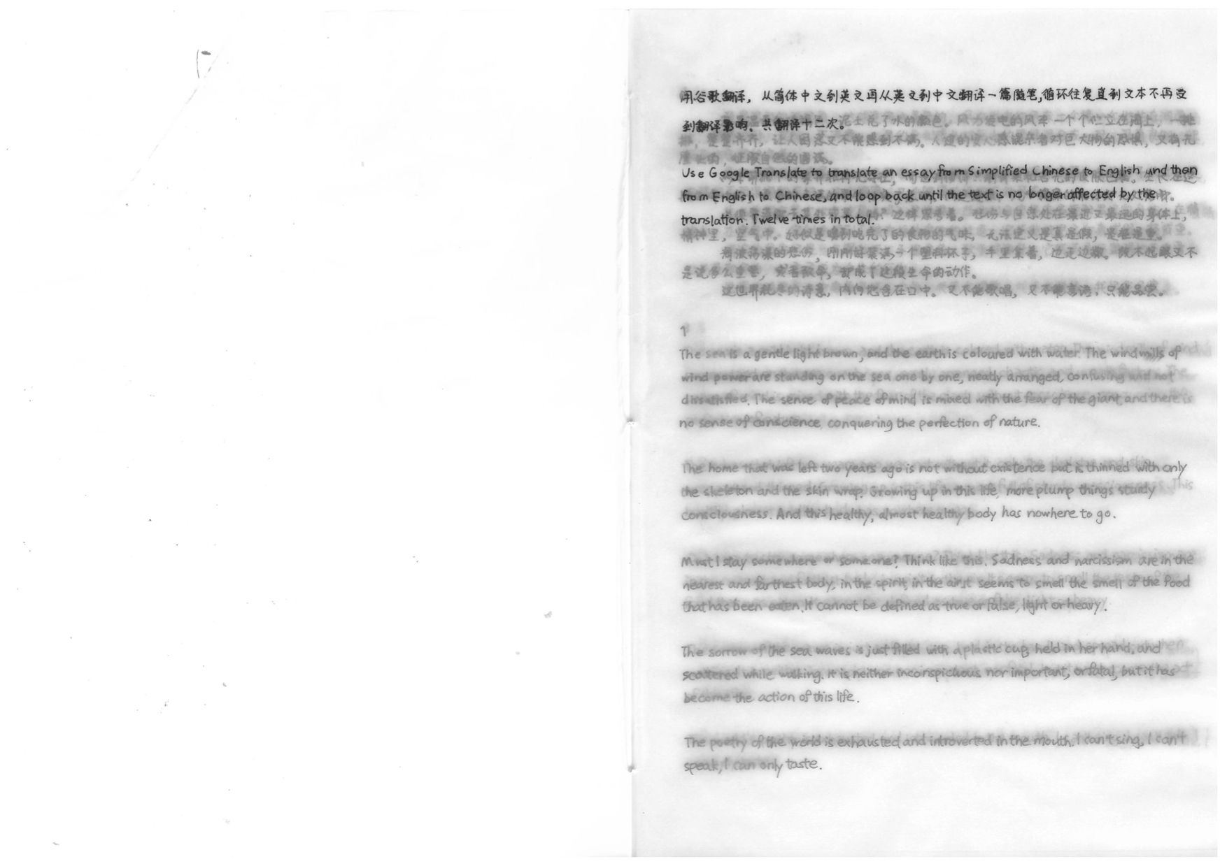 Use Google translate to translate an essay from Simplified Chinese to English and then from English to Chinese , and loop back until the text is no longer affected by the translation. Twelve times in total.