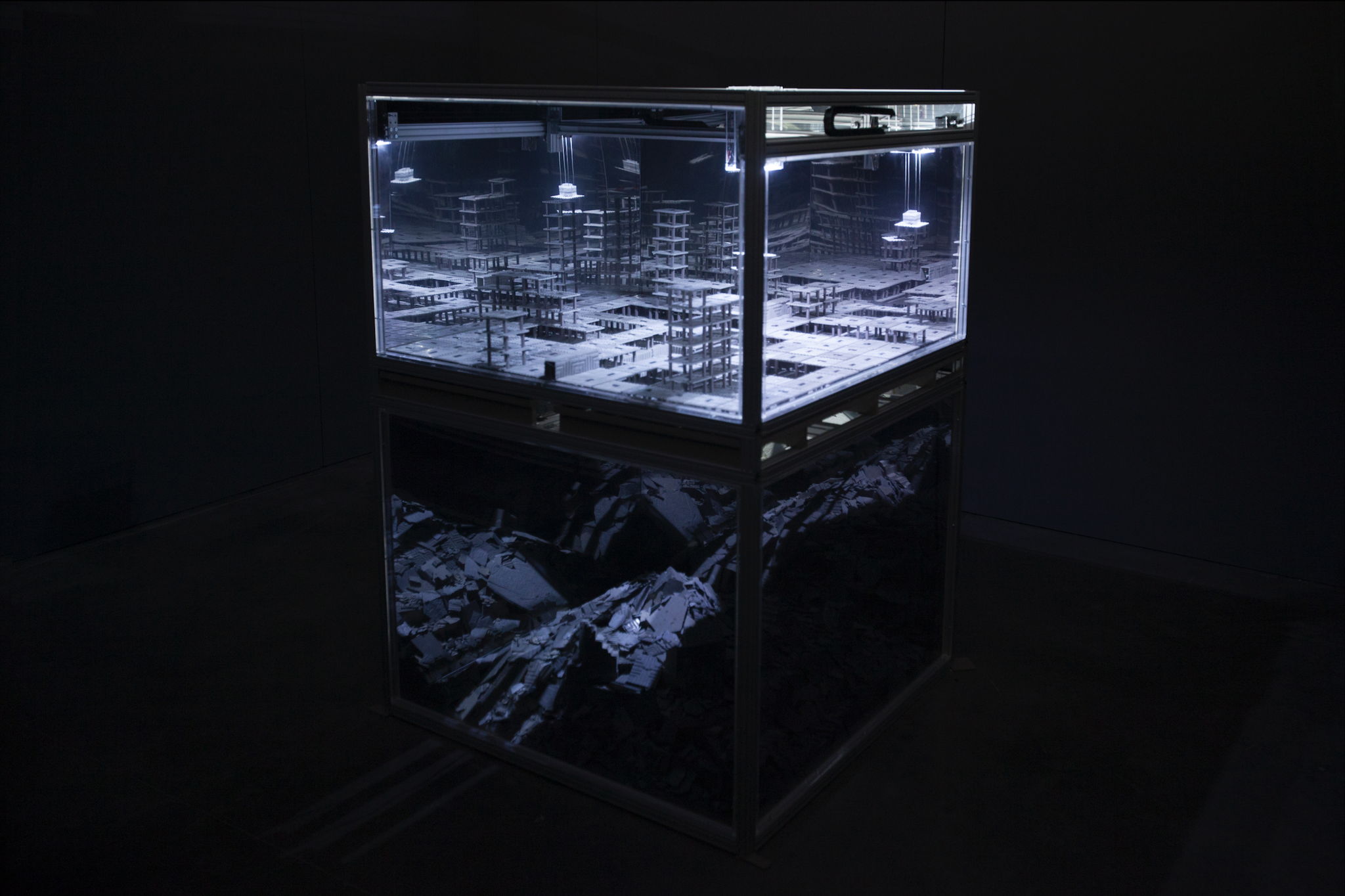 Cénotaph 0 is an automated installation that builds and un-builds an infinite concrete model inspired by these real landscapes. This liminal state of in-between exists in the entire installation, the elements are produced using an experimental mix of computer assisted and artisanal techniques, their slimness and brittleness induced many broken elements during production and even during presentations when the machine makes mistakes. These broken elements accumulate in a second inner landscape in a tumulus-like shape faintly lit by the machine.