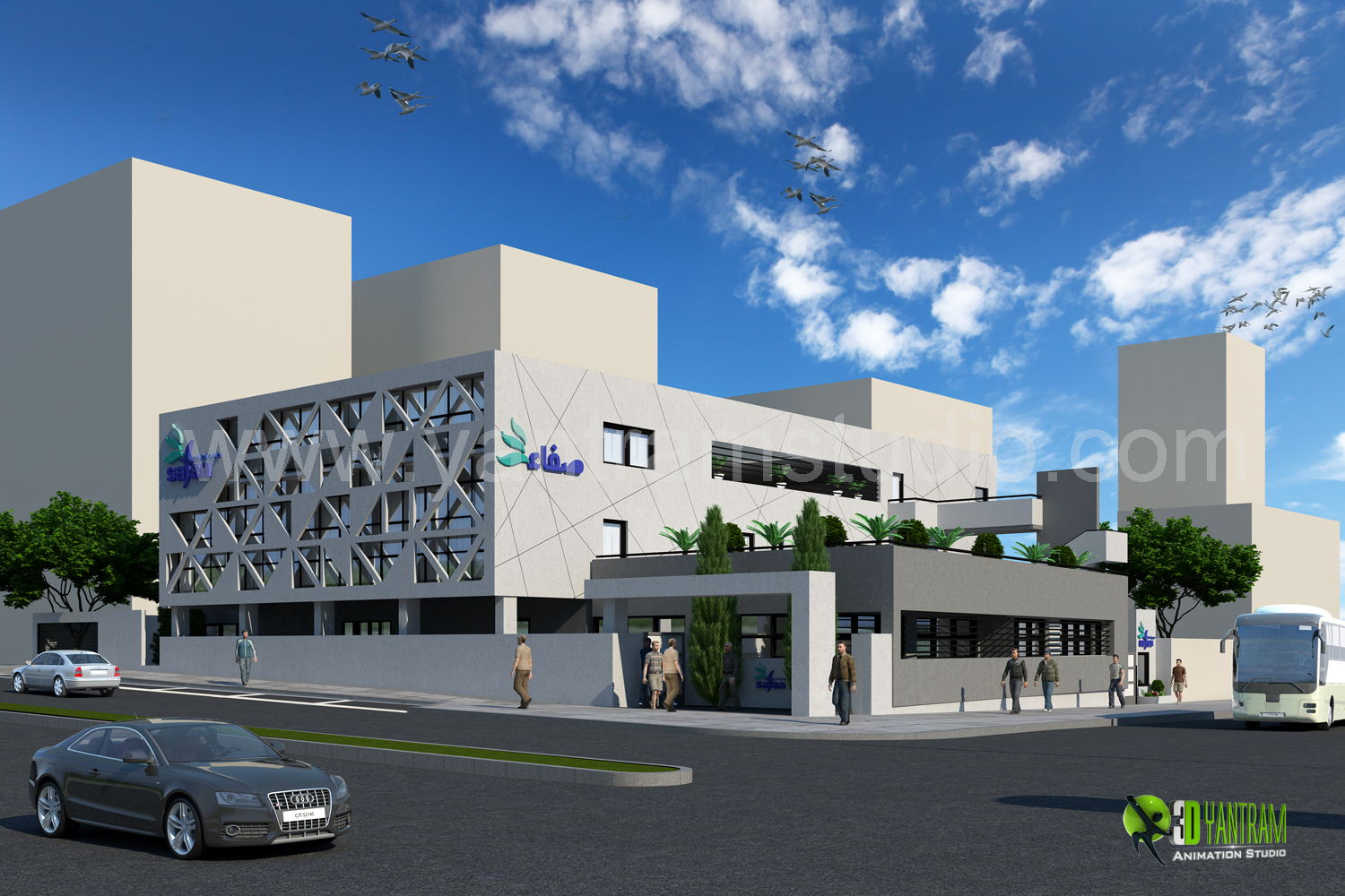 3D Commercial Office Exterior Rendering Design and Animation by Yantram Studio. Modern architecture covers different elements of the way the design has been planned and implemented. Architectural 3D rendering is the most sought after and popular technique used today by the architectural industry.
