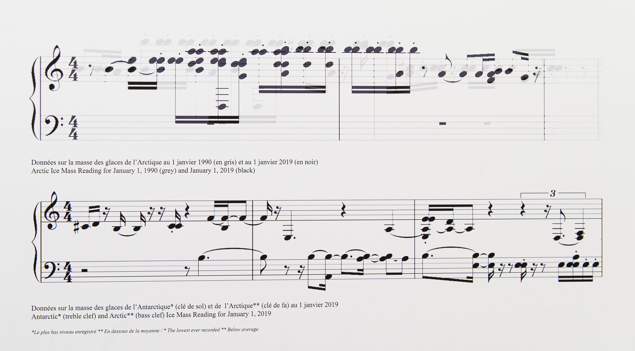 Requiem for the Polar Regions is an aural record of the shifting masses of sea ice in the Arctic and Antarctic oceans, both the annual melt and reformation of ice, and the long term decline of ice in the Arctic. Using the data provided by the National Snow and Ice Data Centre in Colorado this automated program generates a musical score based on the perimeter and concentration of sea ice in the Arctic and Antarctic. The program maps the coordinates of the ice imagery to a musical scale, generating a distinct composition each day. Ice which reaches closer to the poles sounds as lower notes, while ice that sits further from the poles sounds as higher notes. The music produced by the program is discordant and jarring, the imperfection of the translation itself pointing to the disorientation and loss of climate change.