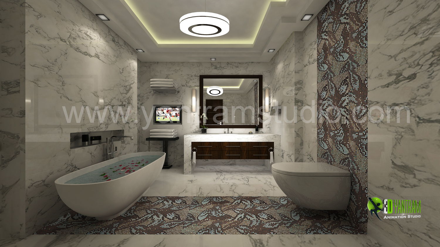 3D Bathroom Interior Design Rendering and Animation by Yantram Studio. Your bathroom is the ultimate place to start displaying your interior design ideas. Because a bathroom is so small, it's a great place to redesign and redecorate. Even if you make mistakes or don't like the design, you can quickly and affordably change it into a work of art you'll love for years to come.