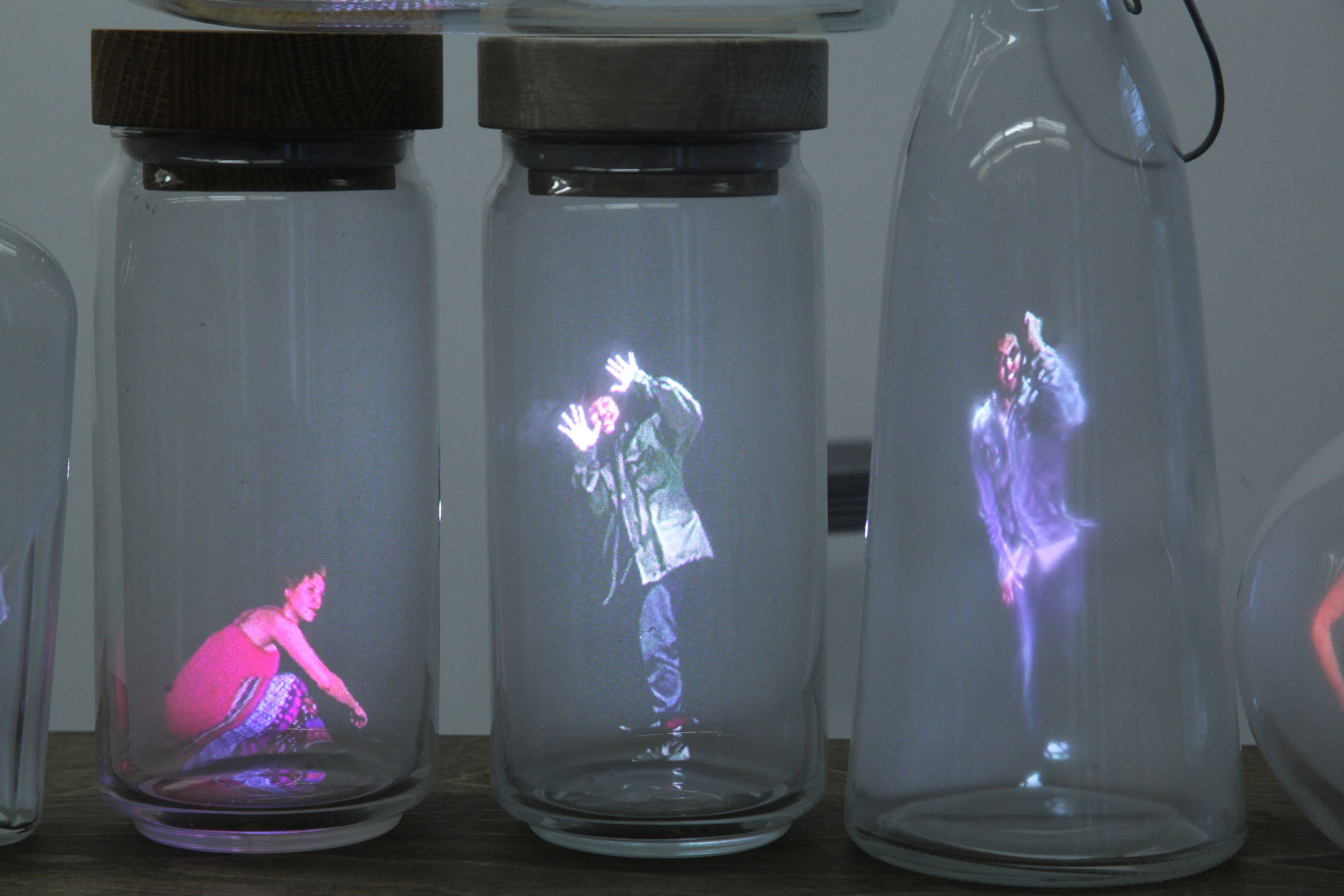 Animalia Chordata comes from the Latin nomenclature for human beings. Six video-projected people representing a range of typologies – from the Wall Street businessman to the precocious little girl – are “trapped” inside glass volumes of varying shapes (including a sinuous Cognac bottle and a chemistry beaker), much like insects are captured in jars. The projection through two panes of glass transforms the traditional two-dimensional video into three-dimensional holographic images.