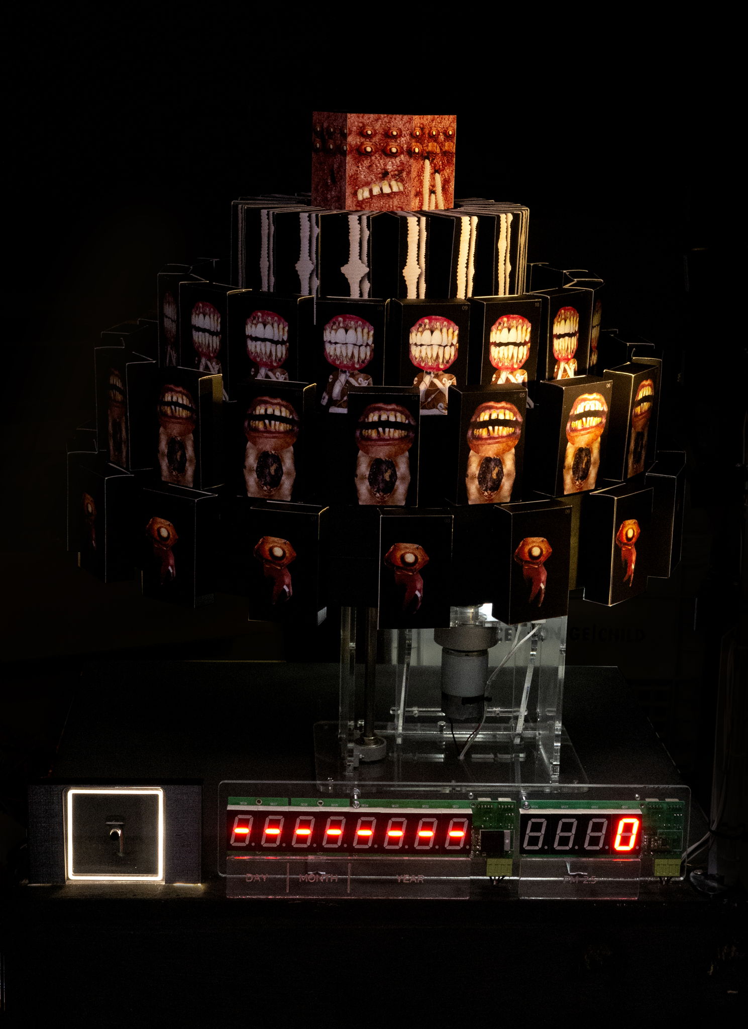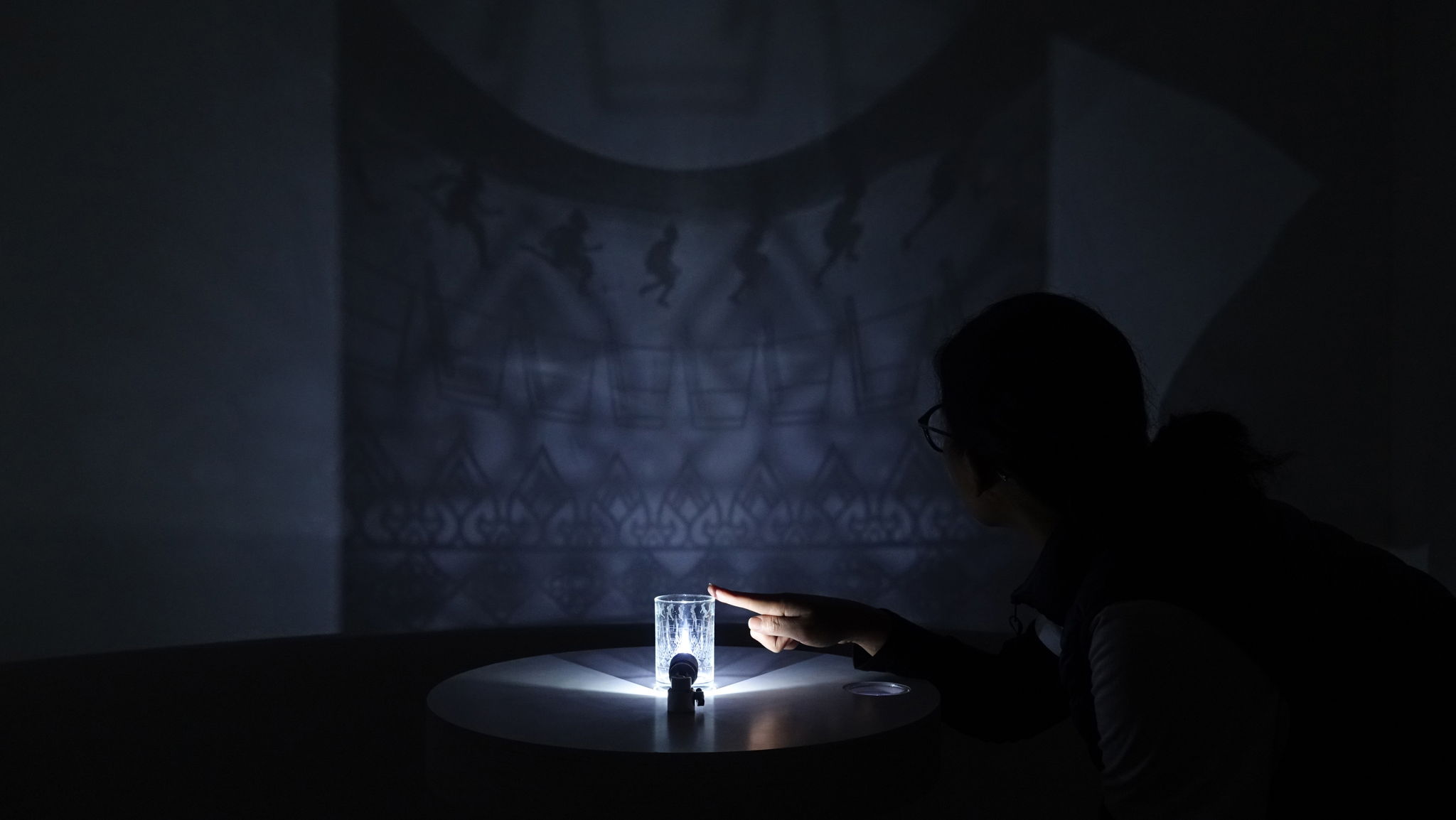 Life/Time is an Interactive Installation which creates a moving image based on the persistence of vision technique on drinking glasses. It is designed for participators to interact with the glasses by dipping their fingers into water and touch the rim of the glasses. The glasses will start moving and creating sounds if pressed and held. As the light shines through the moving glasses, the still images on the glasses will start to appear as one moving image and come to life. Each glass is different in size, shape and sound. The participant can choose to change the glasses and explore the various stories in each one.