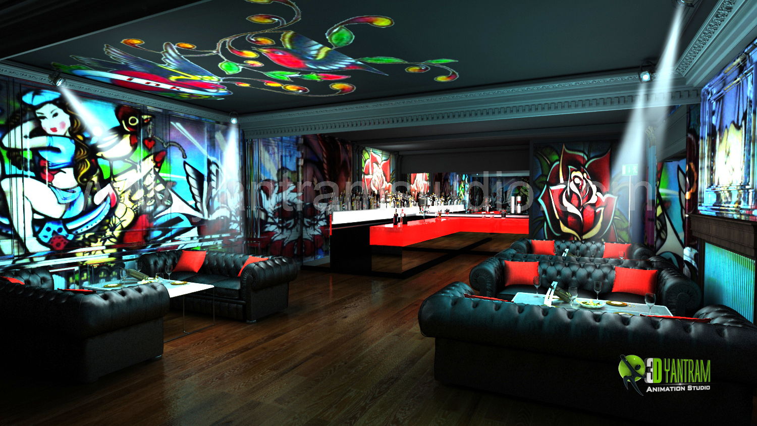 The fixing the all-important interior crevices would require total disassembly, time better spent creating a new Bar. Bar interior designers have to organize a plan like any other process. The interior designing process can take a long time depending on the expectations of the bar owner. 3D Interior Design Rendering For Commercial Night View Pub Bar Animation by Yantram Studio.