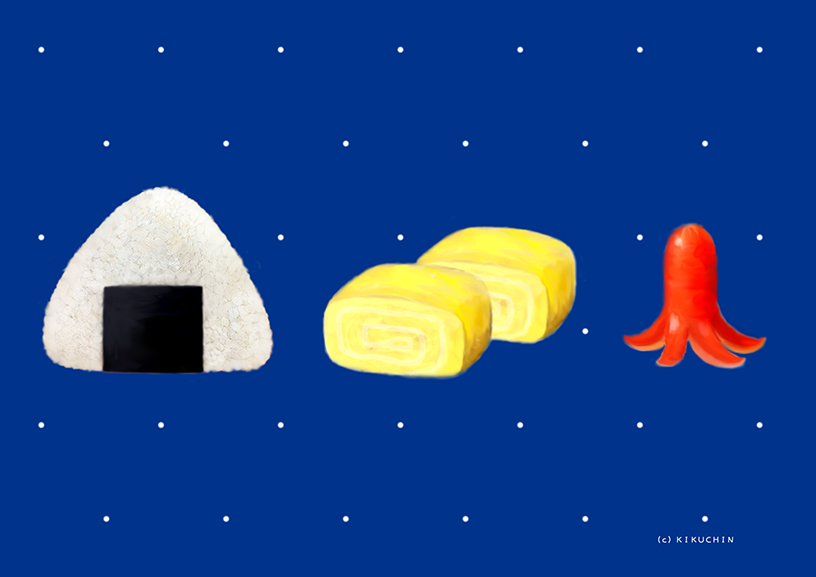 おにぎり、めだまやき、タコさんウィンナー