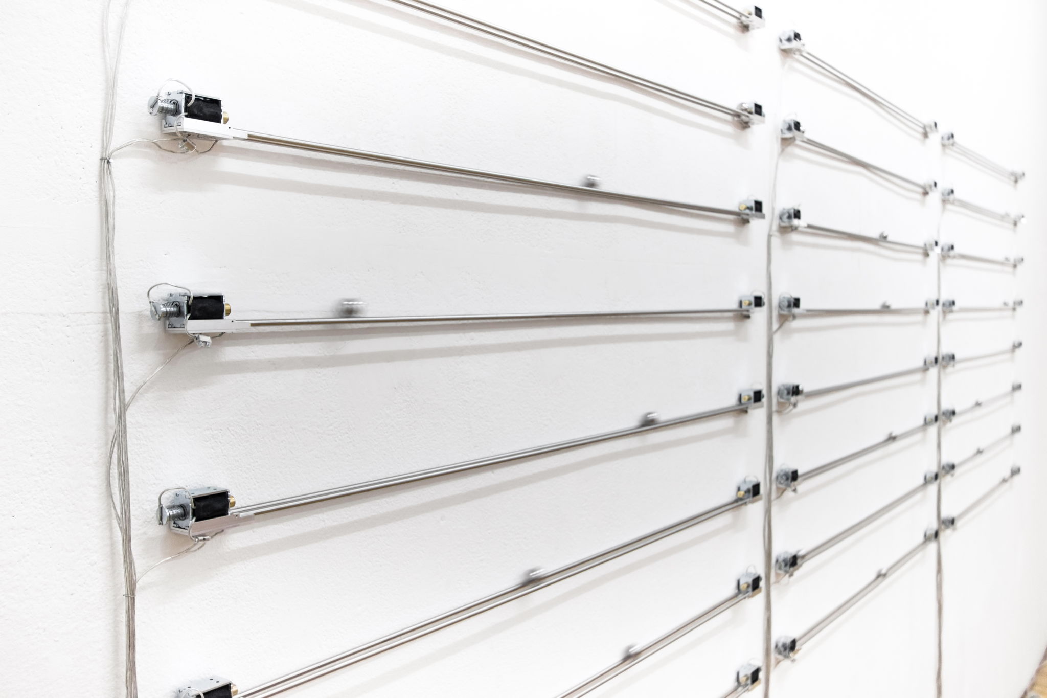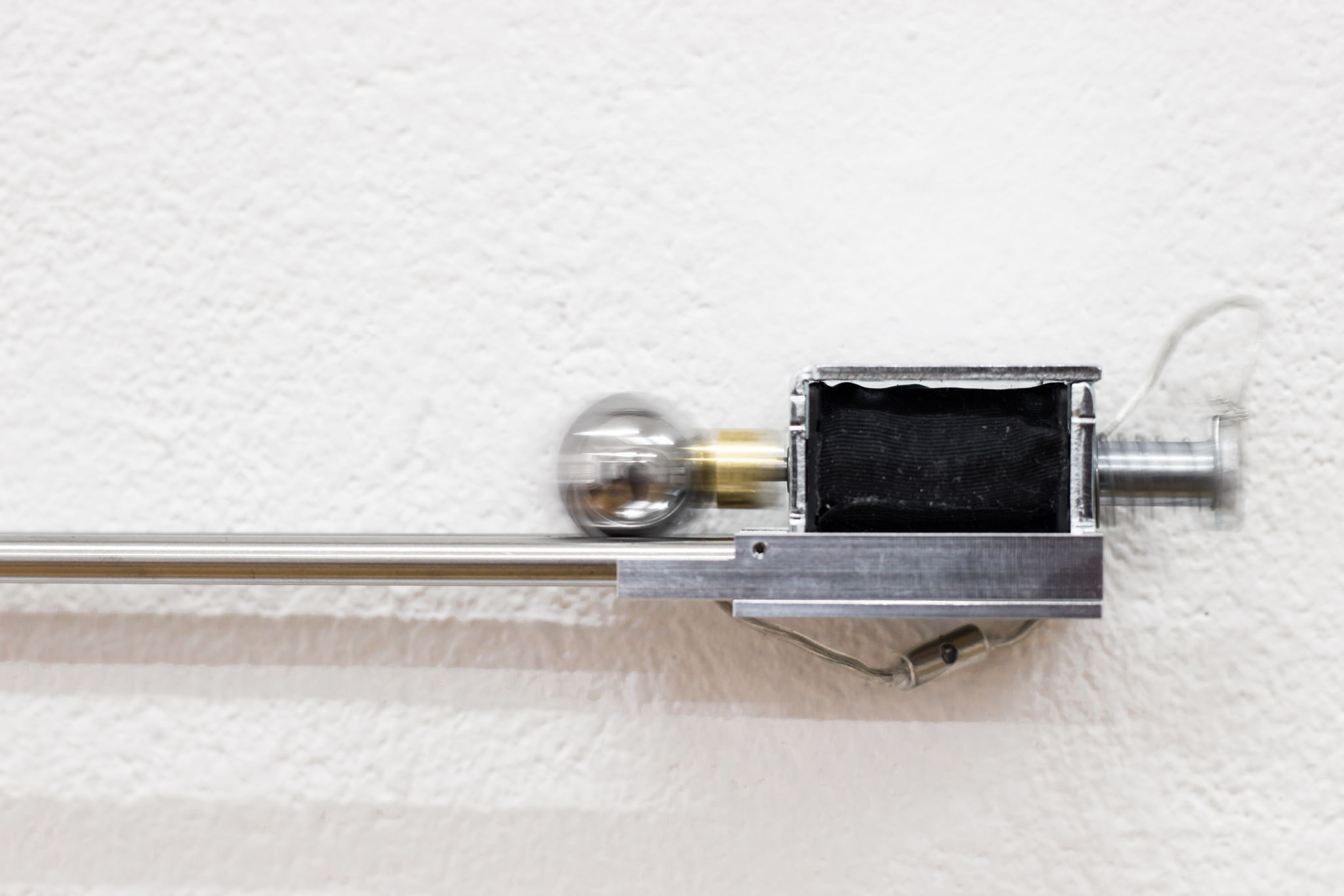 Soon after the beginning by applying electricity to the installation, the resulting rhythm of solenoid bolts hitting metal balls starts shifting and recreates it self over and over again in endless possibilities. There are several factors influencing the sound beside the mechanical inaccuracy of the the solenoids - the friction of the balls on the rails, the characteristic of the wall, the installation is mounted on, the size of the space and the position of the spectator. At the end of a cycle the electricity gets cut and the balls rest in their last position. Leaving the spectator in a silent space where slowly the atmosphere sound fades in.