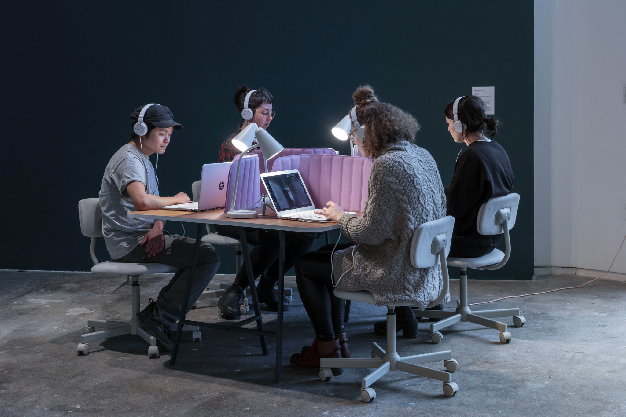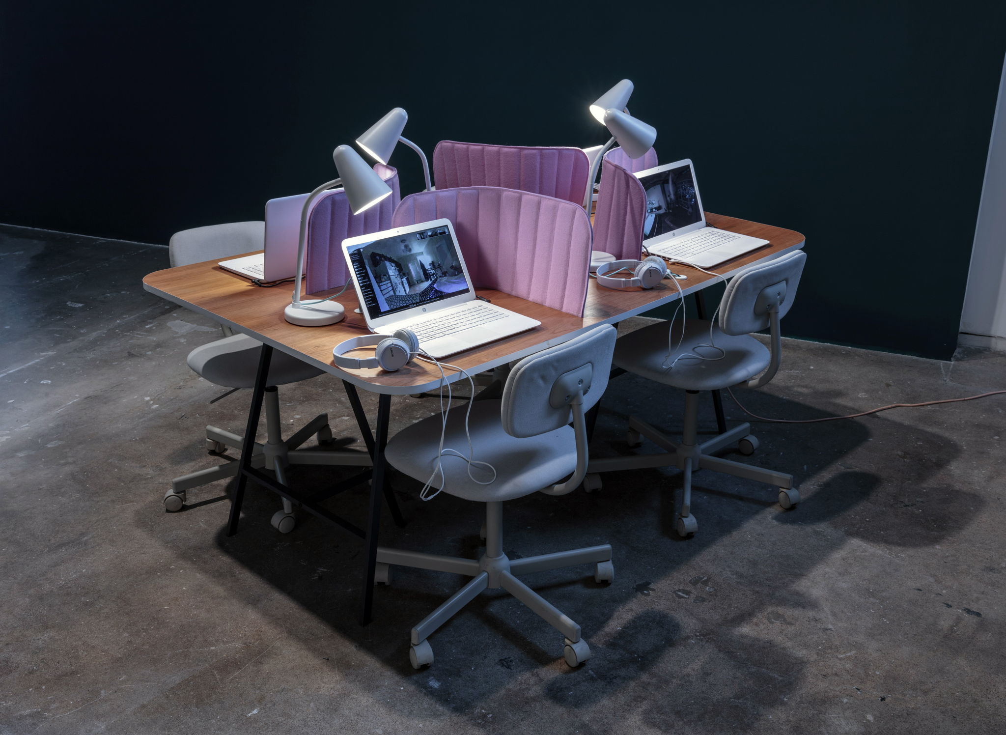 SOMEONE imagines a human version of Amazon Alexa, a smart home intelligence for people in their own homes. For a two month period in 2019, four participants’ homes around the United States were installed with custom-designed smart devices, including cameras, microphones, lights, and other appliances. 205 Hudson Gallery in NYC housed a command center where visitors could peek into the four homes via laptops, watch over them, and remotely control their networked devices. Visitors would hear smart home occupants call out for “Someone”—prompting the visitors to step in as their home automation assistant and respond to their needs. This video installation presents documentation from the initial performance on four screens throughout the space.
