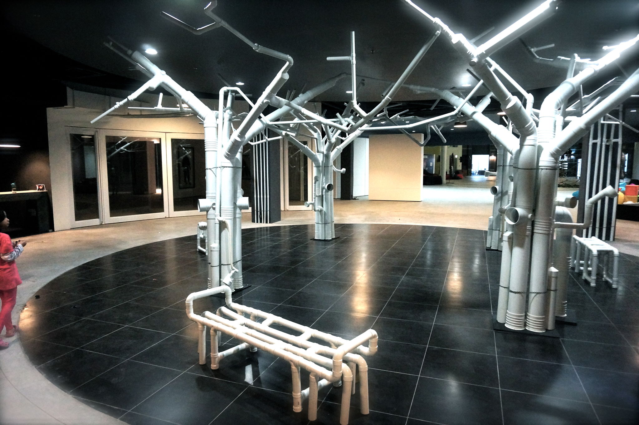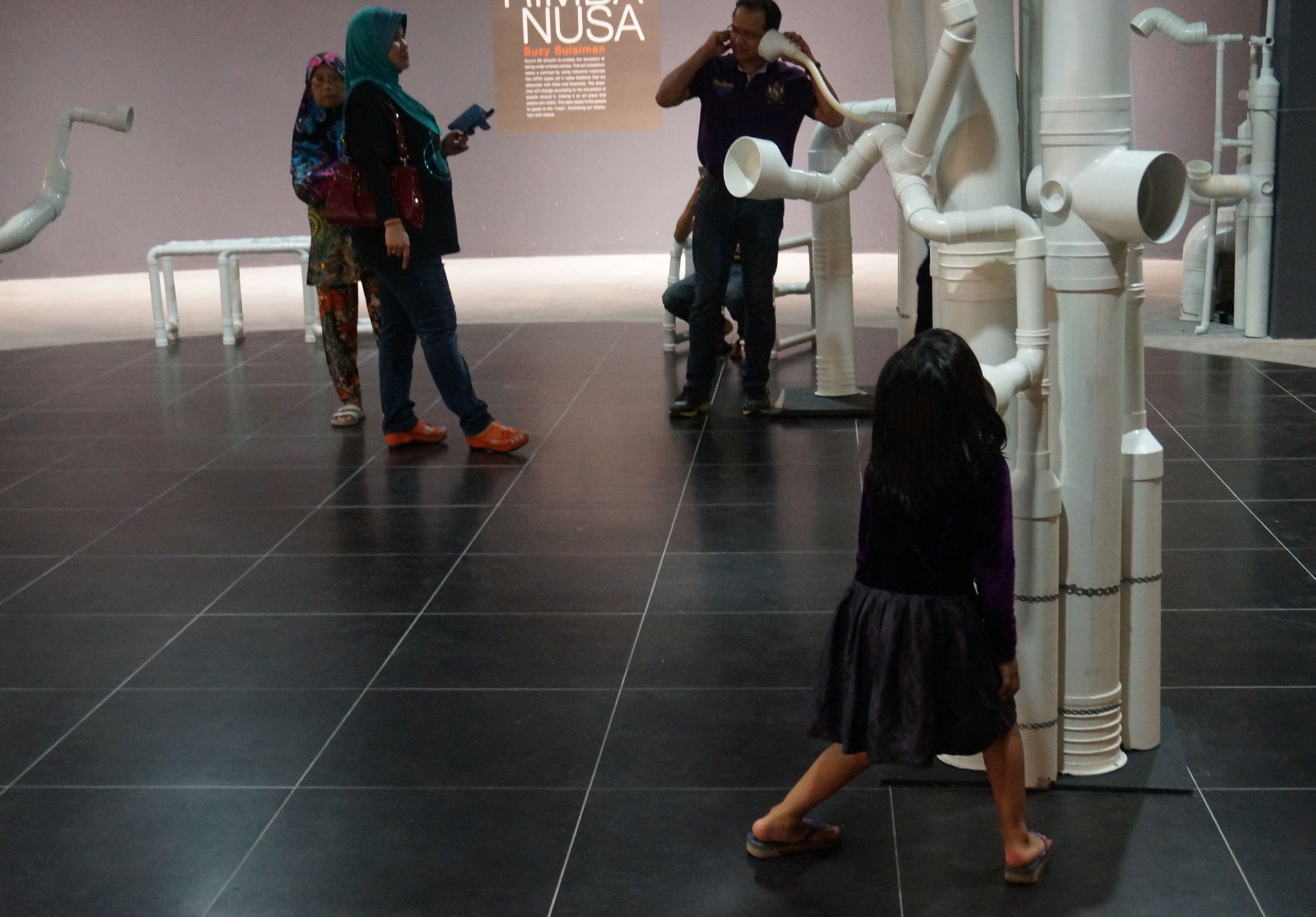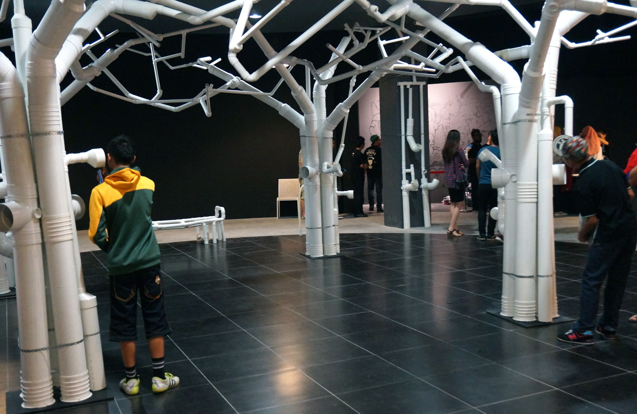 My intention is to create the sensation of being under a forest canopy. It attempts to re create a man-made forest from man-made materials. Inspired by the surrounding massive construction “development” Johor is going through, this work uses building materials to mimic a forest. The contrast between using industrial materials like UPVC pipes yet it casts shadows that we associate with trees, branches and nature. The artwork also emits a soundscape that mimics nature and invites visitors to interact with its sound-making.