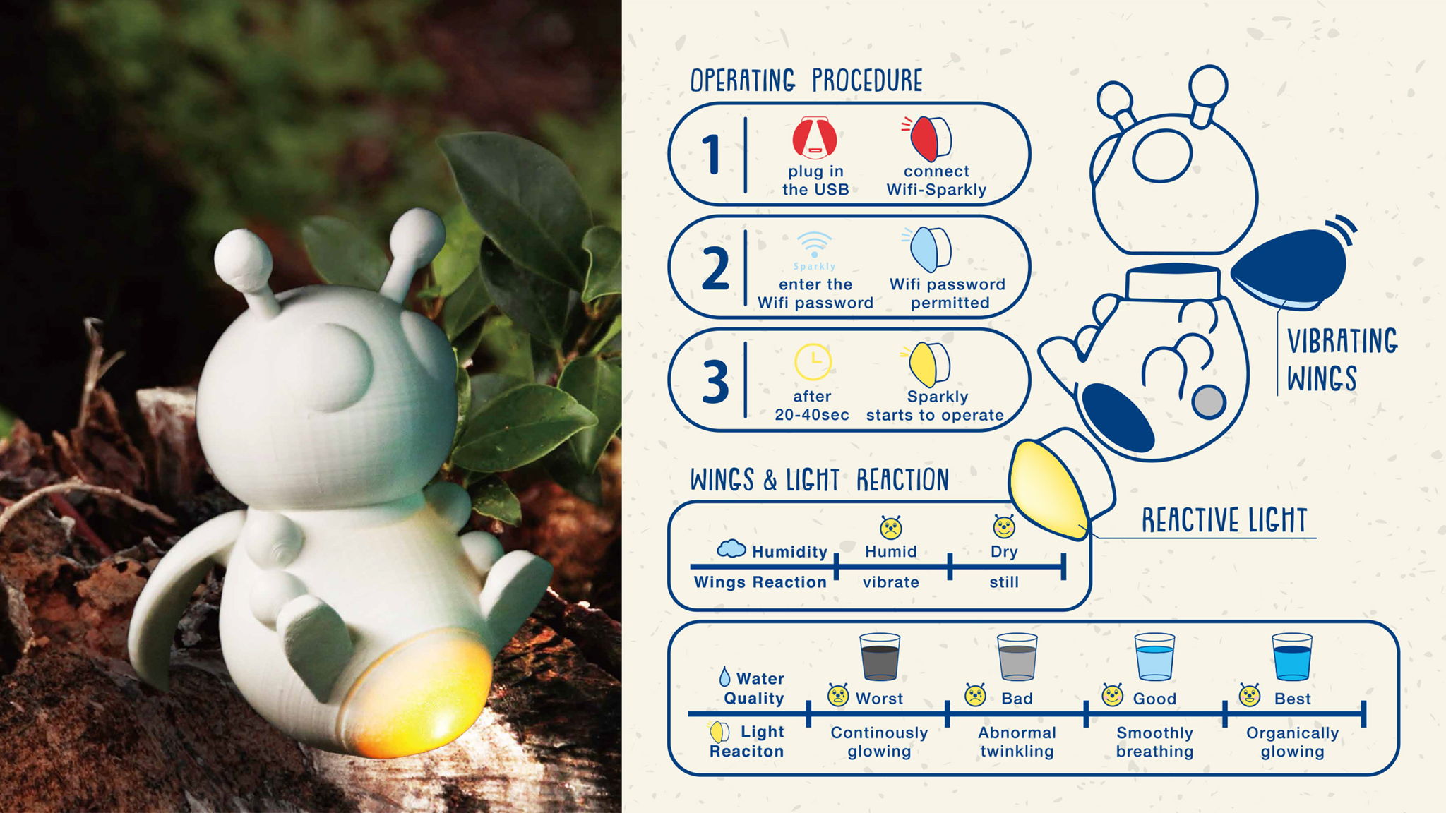 The Sparkly and Its Home is an Interactive IoT (Internet of Things) system that simplifies the hardly comprehensible environmental recovery data as cute figure’s activity, motion graphics and animations. Environmental pollution is an issue for every country nowadays. To raise and pass on environmental awareness has become an urgent priority. We design a figure with the shape of a firefly and an interactive landscape information display system to achieve this goal.