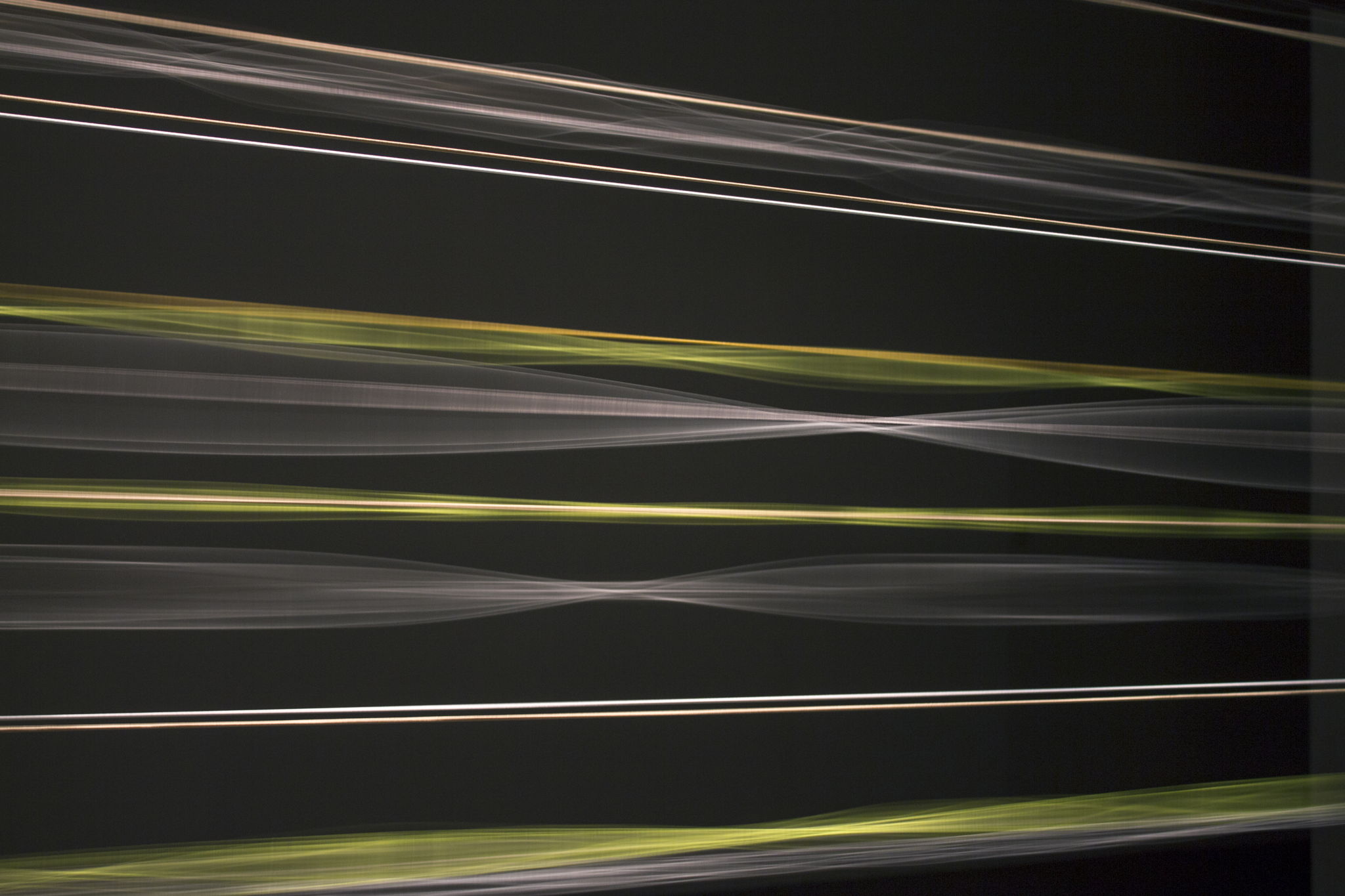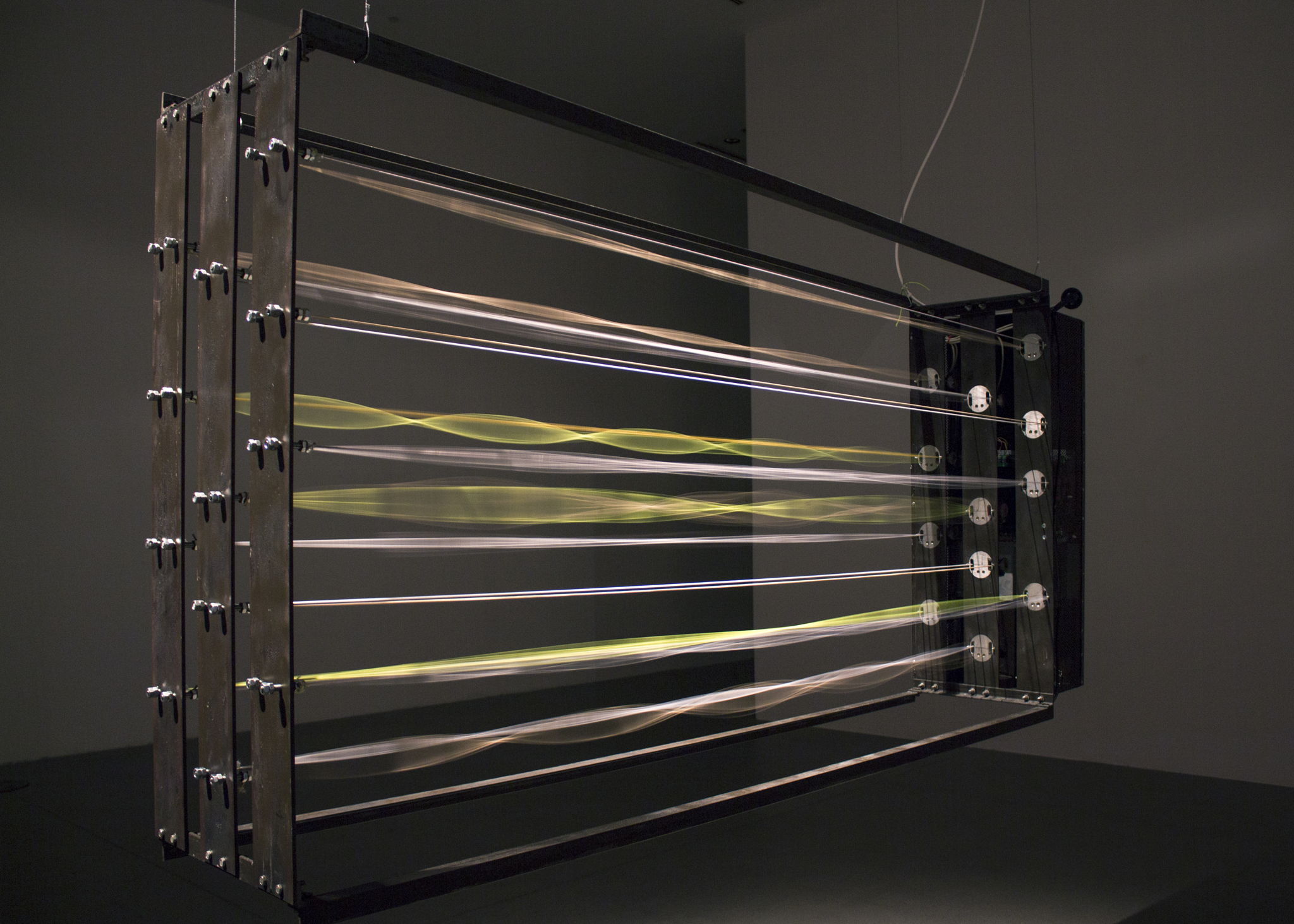 The object contains a duality between enclosed space, source of vibrations and simulated open space in which the vibrations generates a kinetic landscape. In the housing of the interior are placed electrical motors that vibrate elastic filaments with various frequencies. The filaments visually lose their linearity and are turned into spindle-shaped forms of different sizes and transparencies, in line with the vibration frequency, overlap and create hum of low frequencies. The various tensions of the filaments produce the diversity of forms. The appearance of the landscape changes in the programmed cycle.