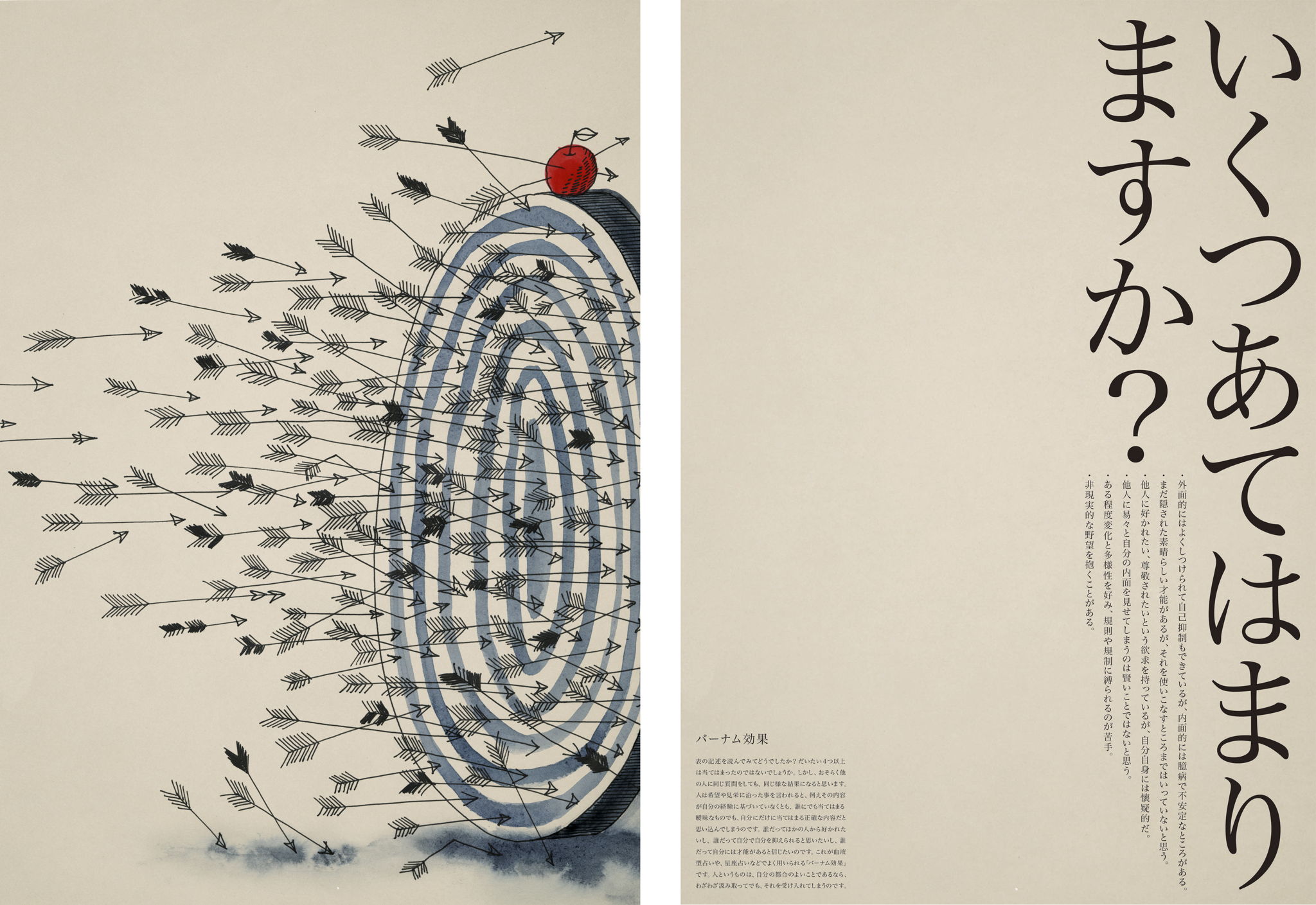 記述を読んでみてどうでしたか?だいたい4つ以上は当てはまったのではないでしょうか。しかし、おそらく他の人に同じ質問をしても、同じ様な結果になると思います。人は希望や見栄に沿った事を言われると、例えその内容が自分の経験に基づいていなくとも、誰にでも当てはまる曖昧なものでも、自分にだけに当てはまる正確な内容だと思い込んでしまうのです。誰だってほかの人から好かれたいし、誰だって自分で自分を抑えられると思いたいし、誰だって自分には才能があると信じたいのです。これが血液型占いや、星座占いなどでよく用いられる「バーナム効果」です。人というものは、自分の都合のよいことであるなら、わざわざ汲み取ってでも、それを受け入れてしまうのです。