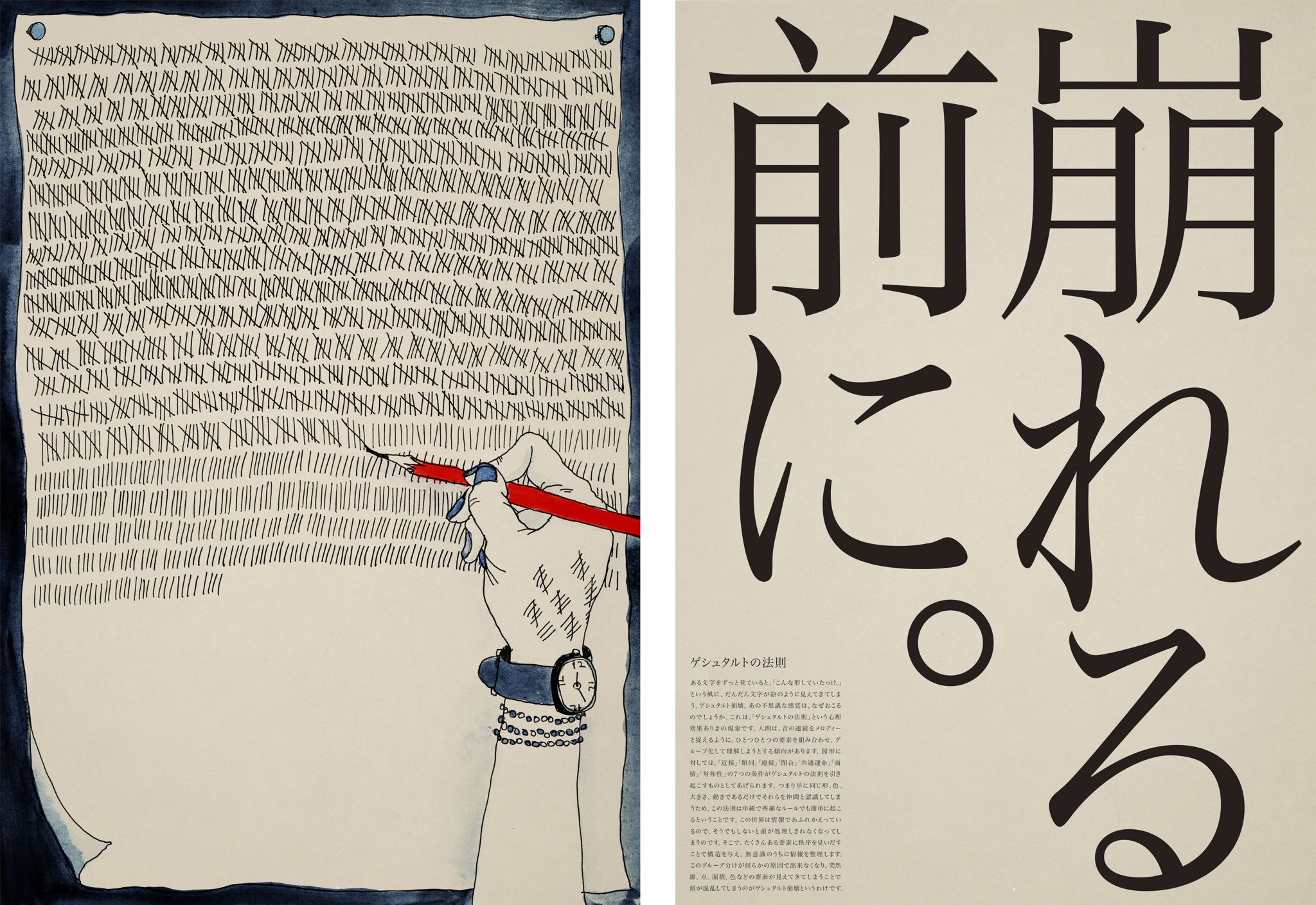 ある文字をずっと見ていると、「こんな形していたっけ。」という風に、だんだん文字が絵のように見えてきてしまう、ゲシュタルト崩壊。あの不思議な感覚は、なぜおこるのでしょうか。これは、「ゲシュタルトの法則」という心理効果ありきの現象です。人間は、音の連続をメロディーと捉えるように、ひとつひとつの要素を組み合わせ、グループ化して理解しようとする傾向があります。図形に対しては、「近接」「類同」「連続」「閉合」「共通運命」「面積」「対称性」の7つの条件がゲシュタルトの法則を引き起こすものとしてあげられます。つまり単に同じ形、色、大きさ、動きであるだけでそれらを仲間と認識してしまうため、この法則は単純で些細なルールでも簡単に起こるということです。この世界は情報であふれかえっているので、そうでもしないと頭が処理しきれなくなってしまうのです。そこで、たくさんある要素に秩序を見いだすことで構造を与え、無意識のうちに情報を整理します。このグループ分けが何らかの原因で出来なくなり、突然線、点、面積、色などの要素が見えてきてしまうことで頭が混乱してしまうのがゲシュタルト崩壊というわけです。