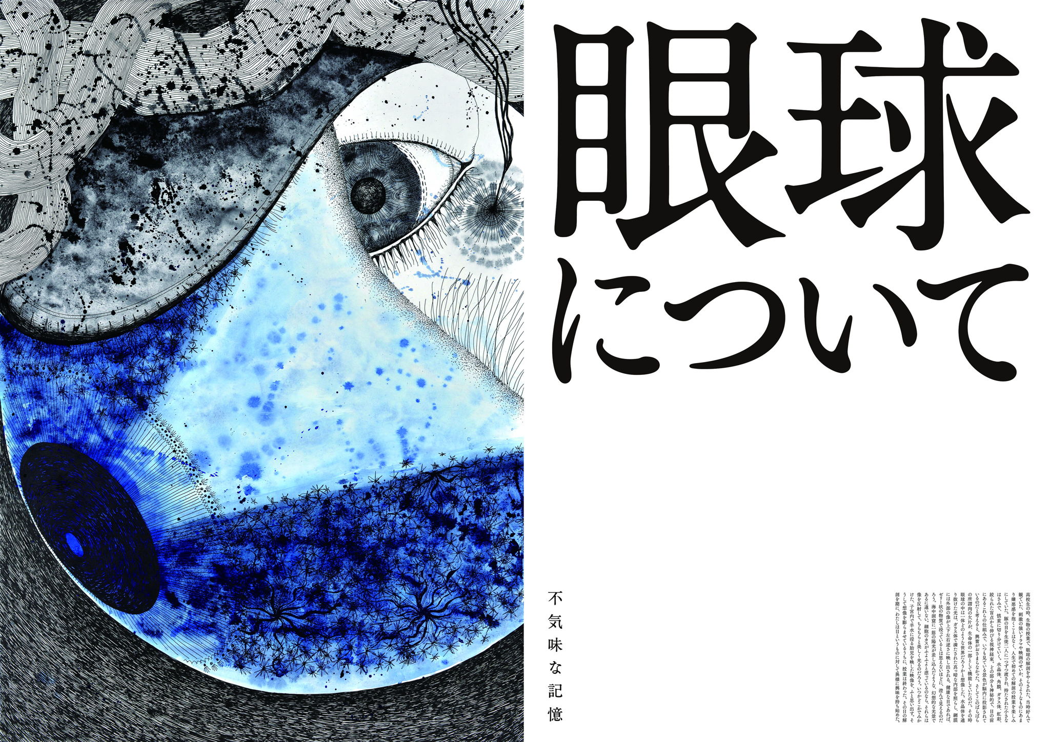 高校生の時、生物の授業で、解剖の授業をやらされた。当時好んで観ていた、刺激の強いドラマや映画のせいか、そのようなものにあまり嫌悪感を抱くことはなく、人生で初めての解剖の授業を楽しみにしていた。豚の目を生徒二人に一つずつ渡され、持たされた小さなはさみで、慎重に切り分けていく。水晶体、角膜、ガラス体、虹彩、絞られた盲点から伸びる視神経束。どの部分も神秘的で、目の前にあるこれらの仕組みで、いつも見ている景色が脳内に投影されているのだと考えると、興奮がおさまらなかった。そしてこのばらばらの所謂肉の欠片が、生命体の一部として機能していたのだ。その時眼球の中は一体どのような世界だろうかと想像した。水晶体を通り抜けた光は、ガラス体で満たされた真っ暗な内部を照らし、網膜には外部の像が上下左右逆さまに映し出される。健康な目であれば、ゼリー状の物質で浸っているとは思えないほどに、澄んで見えるのだろう。海中洞窟に一筋の陽光が差し込んだような、幻想的な光景であるに違いない。細胞のカスがふよふよと漂っているのなら、それらは像を反射して、ちらちらと美しく光るのだろう。いつかどこかでみかけた、子宮内で羊水に浸る胎児を映した映像を、ふと思い出す。そうして想像を膨らませているうちに、授業は終わった。その日の解剖を期に、わたしは目というものに対して異様に興味を持ち始めた。