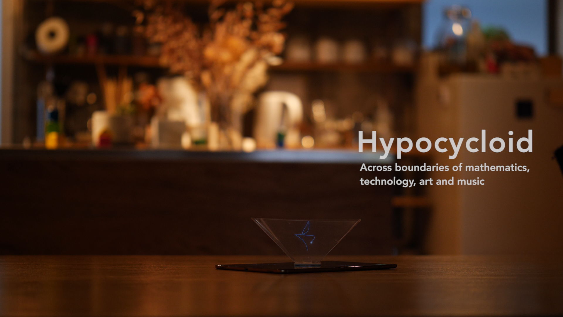 ハイポサイクロイドは、外円の内側を、小さな円が内接したまま回転した時に、内円上の定点が描く軌跡。本作では、さらに外円を地球の自転のように回転させることで、3次元の軌跡が画面上に描かれるようにした。透明なパネルをその上に置くと、空中には、あたかもそこに存在するかのように、美しい軌跡が浮かび上がる。