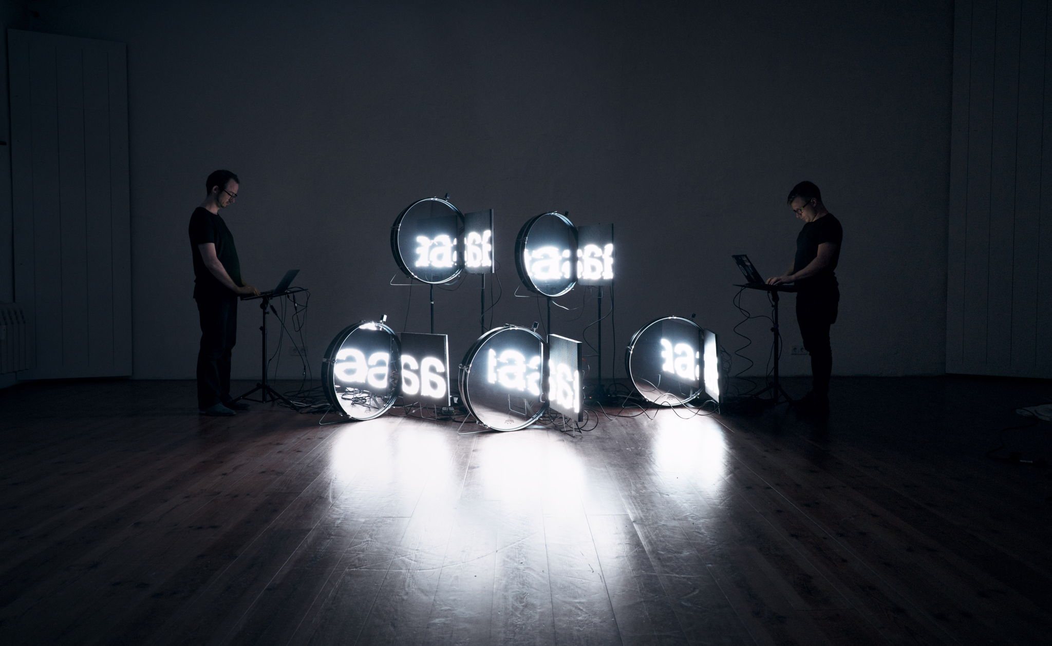 Exploring the boundaries where music and language overlap, Nicola L. Hein and Lukas Truniger use hybrid instruments – constructed from drum-skins and electronic components – as devices to turn written texts into pulses of light and percussive sound. As each machine translation emerges, the network of instruments starts to share the texts, transforming written material into visual and sonic patterns, for the performers and spectators to further interact with. Extrapolating from the example of the African talking drum, Membranes builds up an altogether new kind of tone language, constantly shifting and adapting itself before the viewer and performers alike.