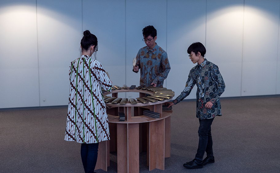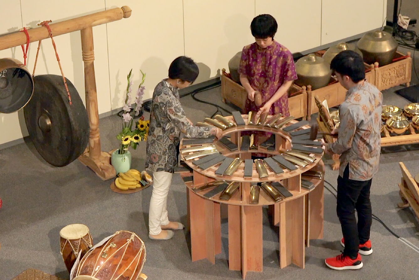 ガムランは、音響や独特な音階から得られる異国情緒に目が向きがちだが、本作品ではガムランの楽器に共通する奏法に着目した。