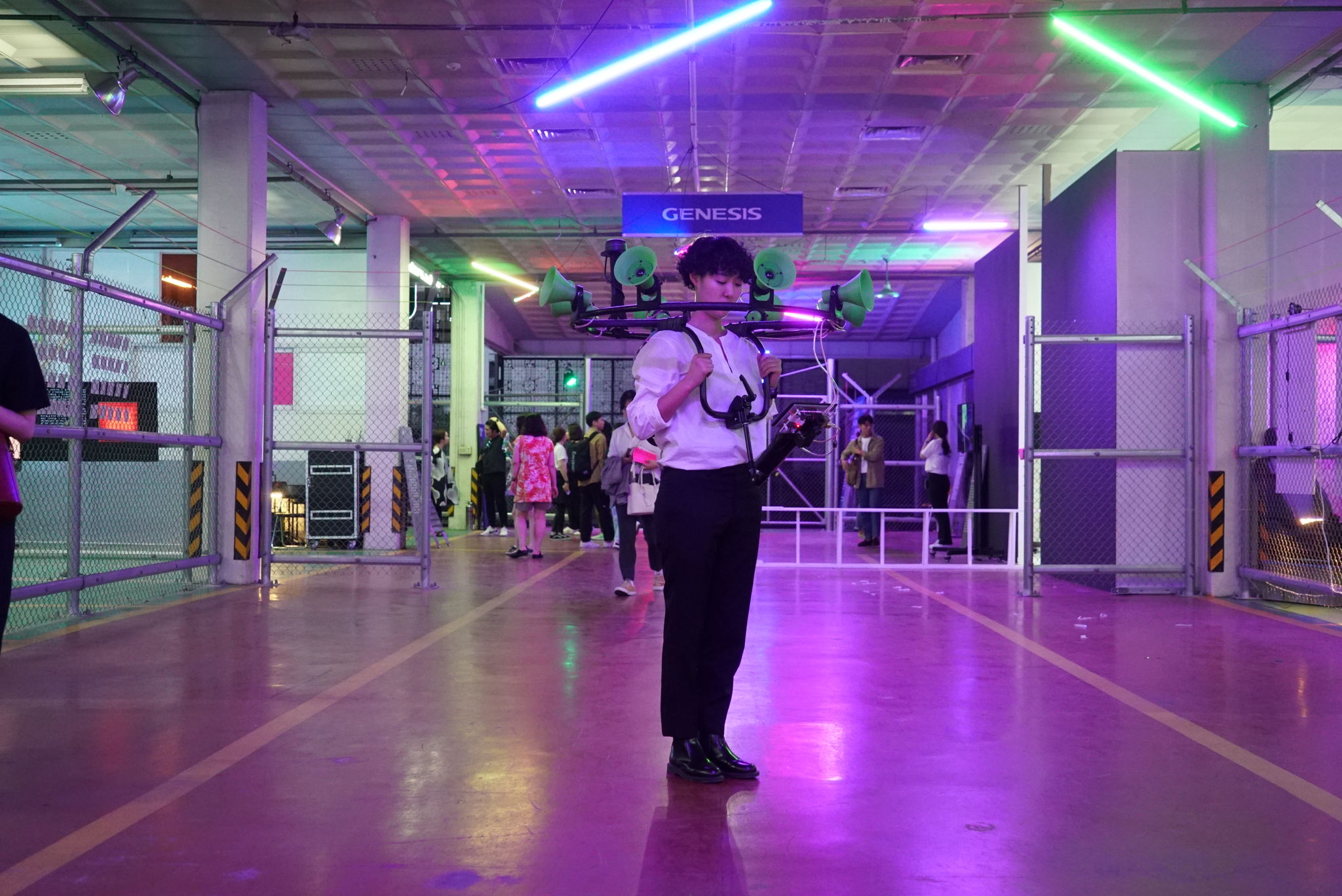 ”DataScape sense” prototypeで自律走行、ロボット掃除機などに使用するLIDARセンサーをハッキングし、パフォーマーと周辺環境を構成するものとの間の距離を測定する。頭の周りに360˚に付着された8つのホーンスピーカーがそれぞれの位置から受け入れだ環境データの変化をリアルタイムにサウンドとし出力する。このサウンドは、ホーンスピーカーを着用したパフォーマーの動きに応じて、まるで波のように押し寄せてきた消えて行くサウンドスケープで演奏される。