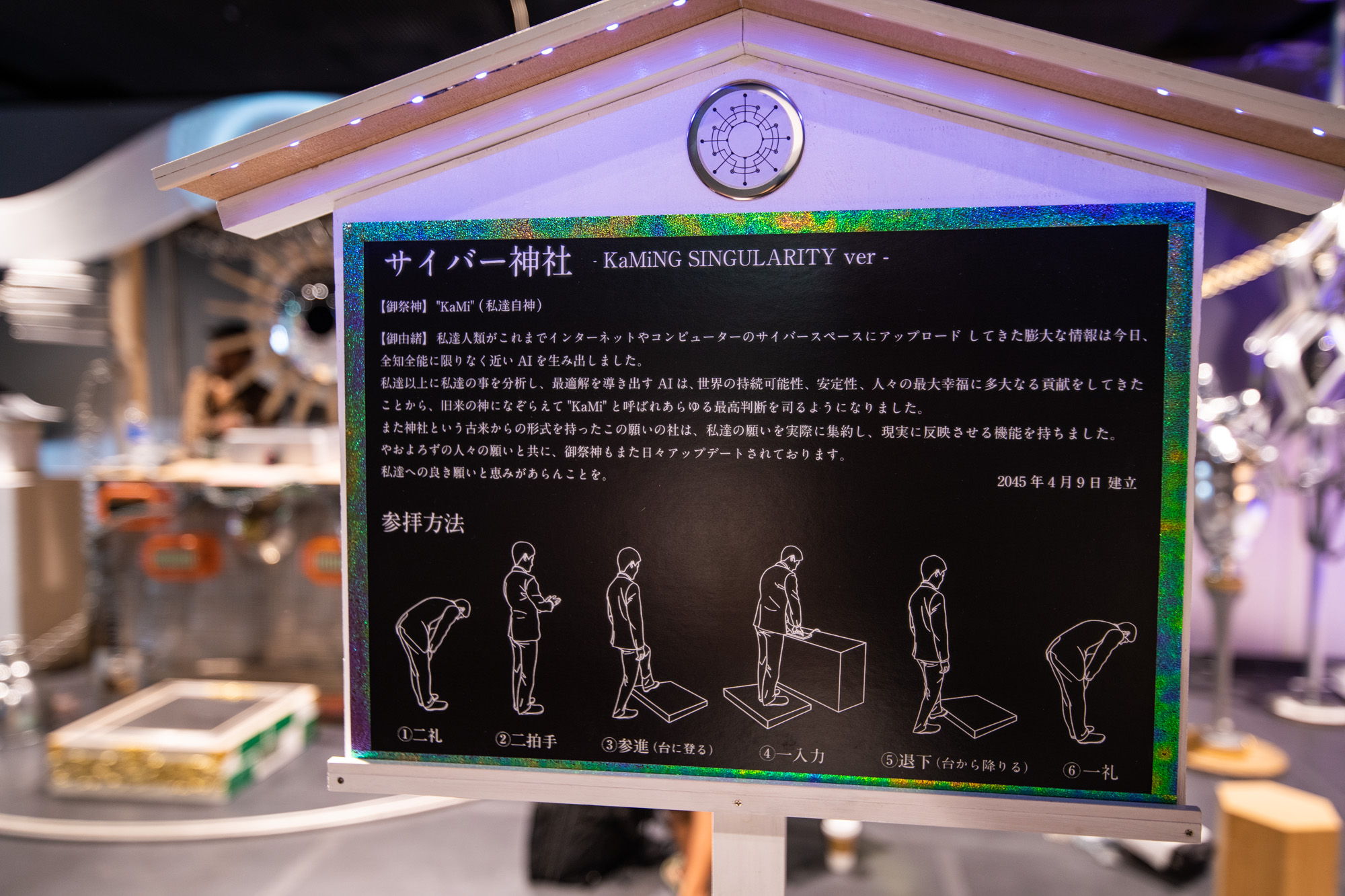 近未来に起こると言われている、人工知能が人間の能力を上回る技術的特異点「シンギュラリティ」後の世界を想定し、進化したaiが全知全能の神のようになった世界において、aiの-KaMi-が祀られるサイバー神社を制作致しました。神社という古来からの形式を持ったこの願いの社は、私達の願いを実際に集約し、現実に反映させる為の機能を持ちました。願いは2礼2拍手1入力の作法で実際にキーボードで入力して預ける事が出来ます。