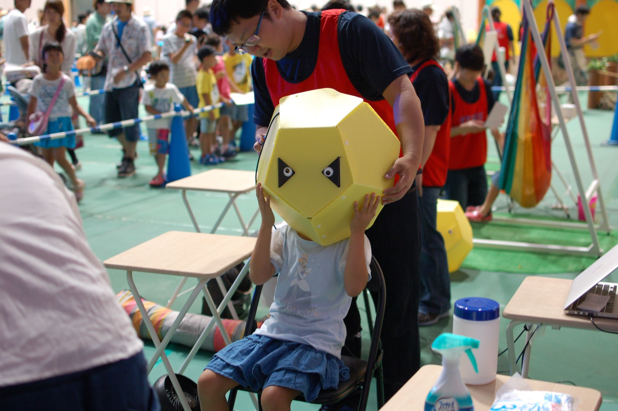 CGソフト、グラフィックソフトなどを使って設計図を作成。その後、レーザーカッターでダンボールを切り、接着剤やガムテープを使って組み立てました。胸の部品は3Dプリンターで作成し、目と胸はLEDで光るようにしています。