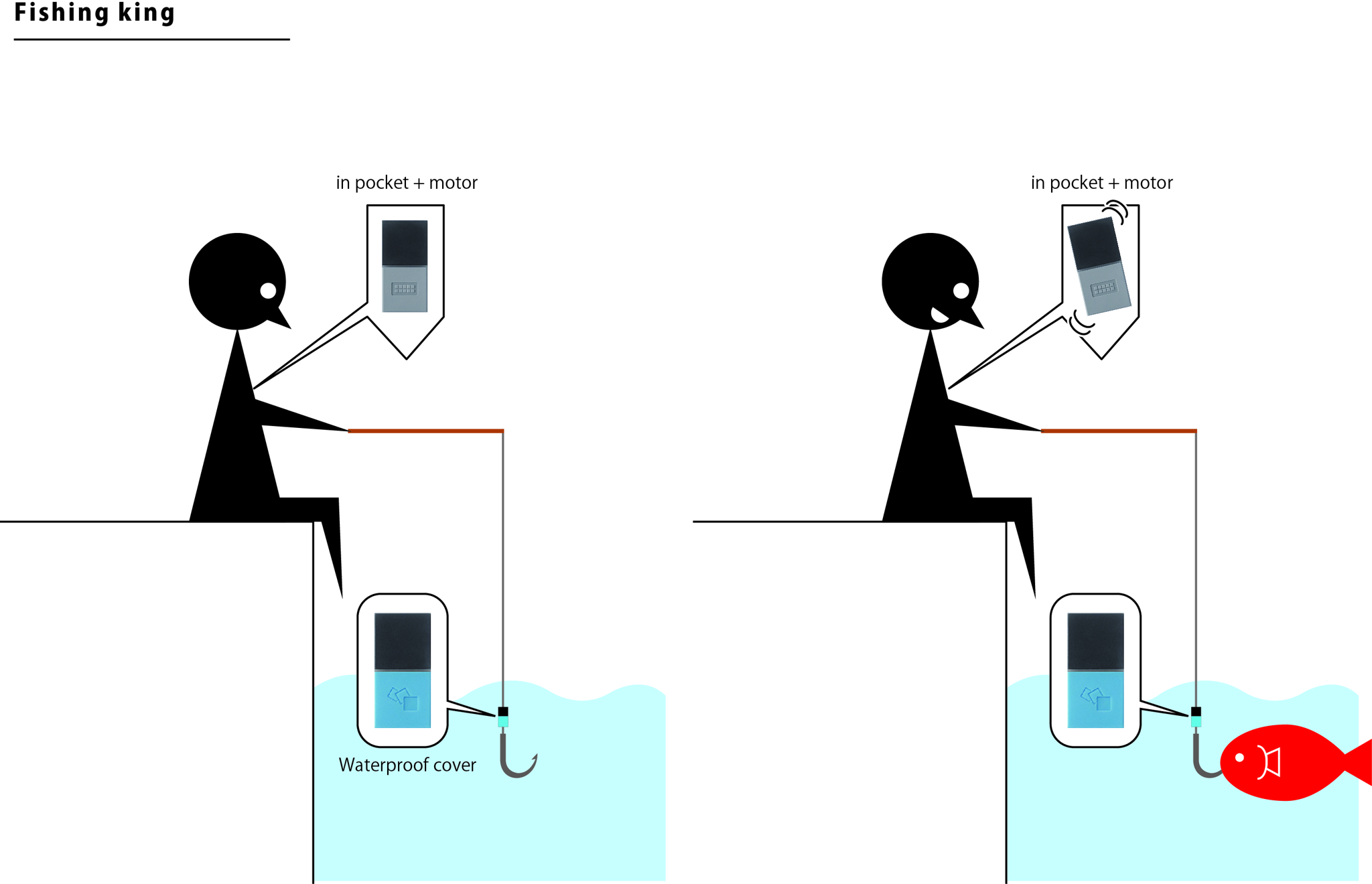 釣り針に防水カバーを付けたブルーMESHを針の上に装着し、魚が食いついた振動を感じ取ると、胸ポケットに入れたモーターをつけたグレーMESHが振動することで魚が食いついたことが分かり、魚が釣れる確率も上がるアイデアです。