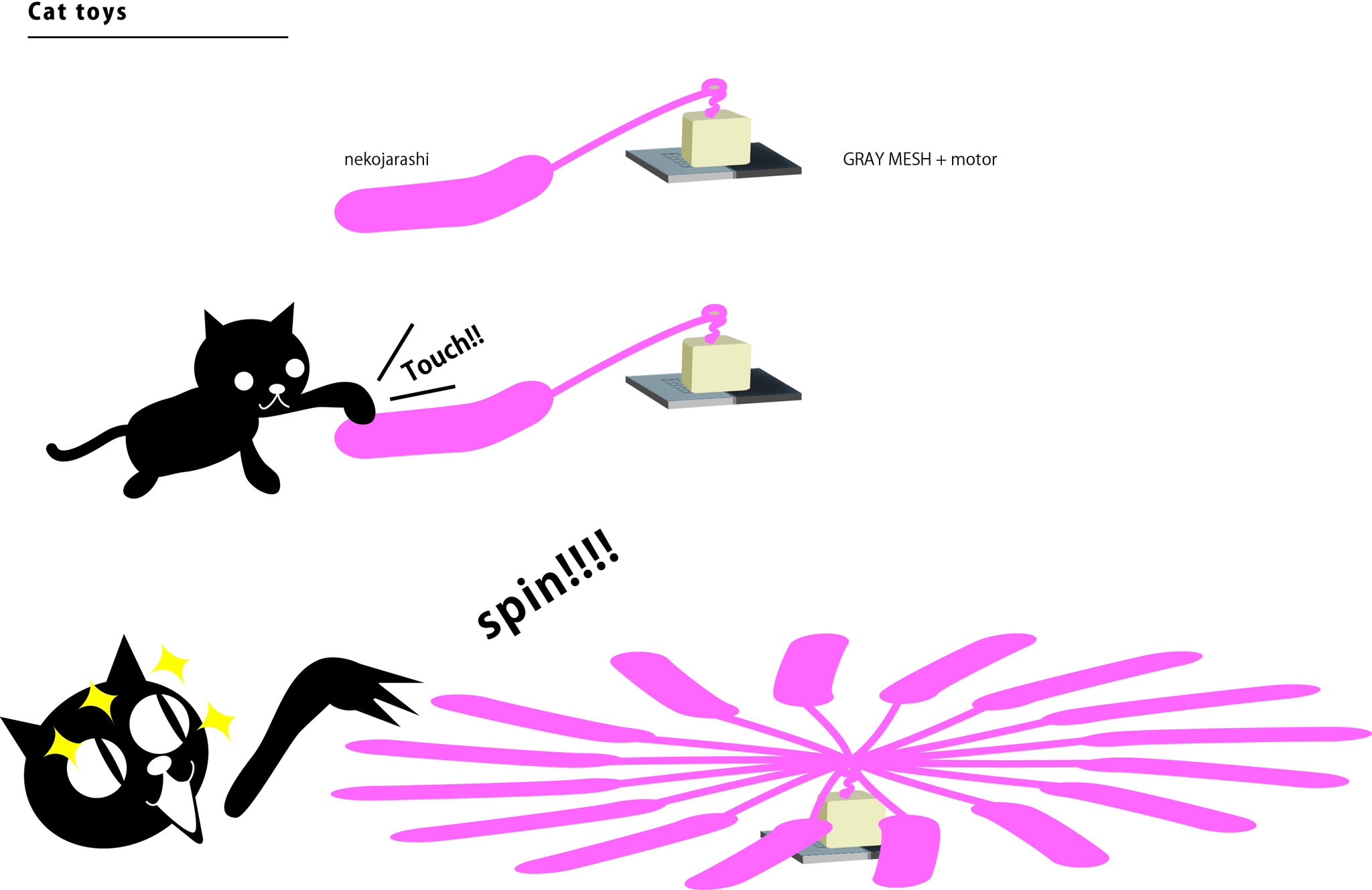 グレーMESHの上にモーターを付け、モーターの先端に猫じゃらしやモフモフしたものを取り付けます。