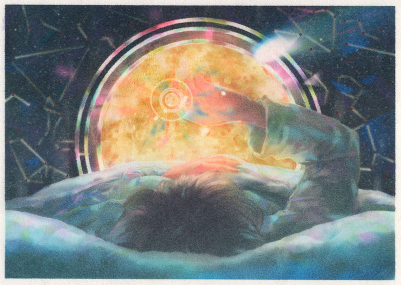 夜、考え事がグルグルしていて眠れないときに 手のひらサイズのプラネタリウムがあればなという想いから。月は占星術だと「家族や一人で居るときの リラックスした状態」。