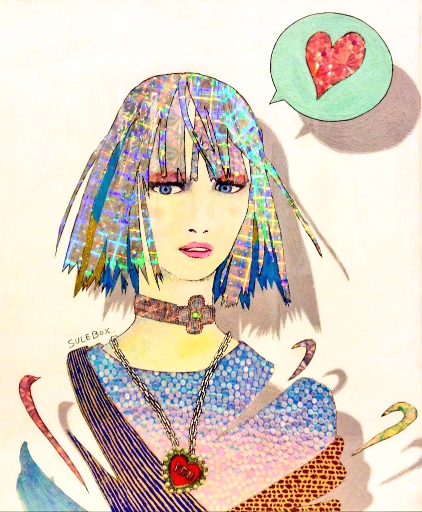 /アクリル絵の具、キラキラの紙、製図ペン