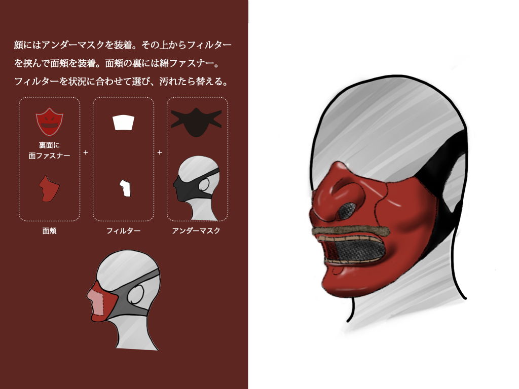 ウィルスや花粉と戦う気持ちを鼓舞する、鎧武者の面頬がコンセプトのマスク。コスプレ感覚で楽しみながら装着でき、面頬のデザインをヒーローなどに変えれば子供も楽しめる。アンダーマスクと面頬の間にフィルターを挟んで使用。フィルターは状況に合わせて自分で用意。
