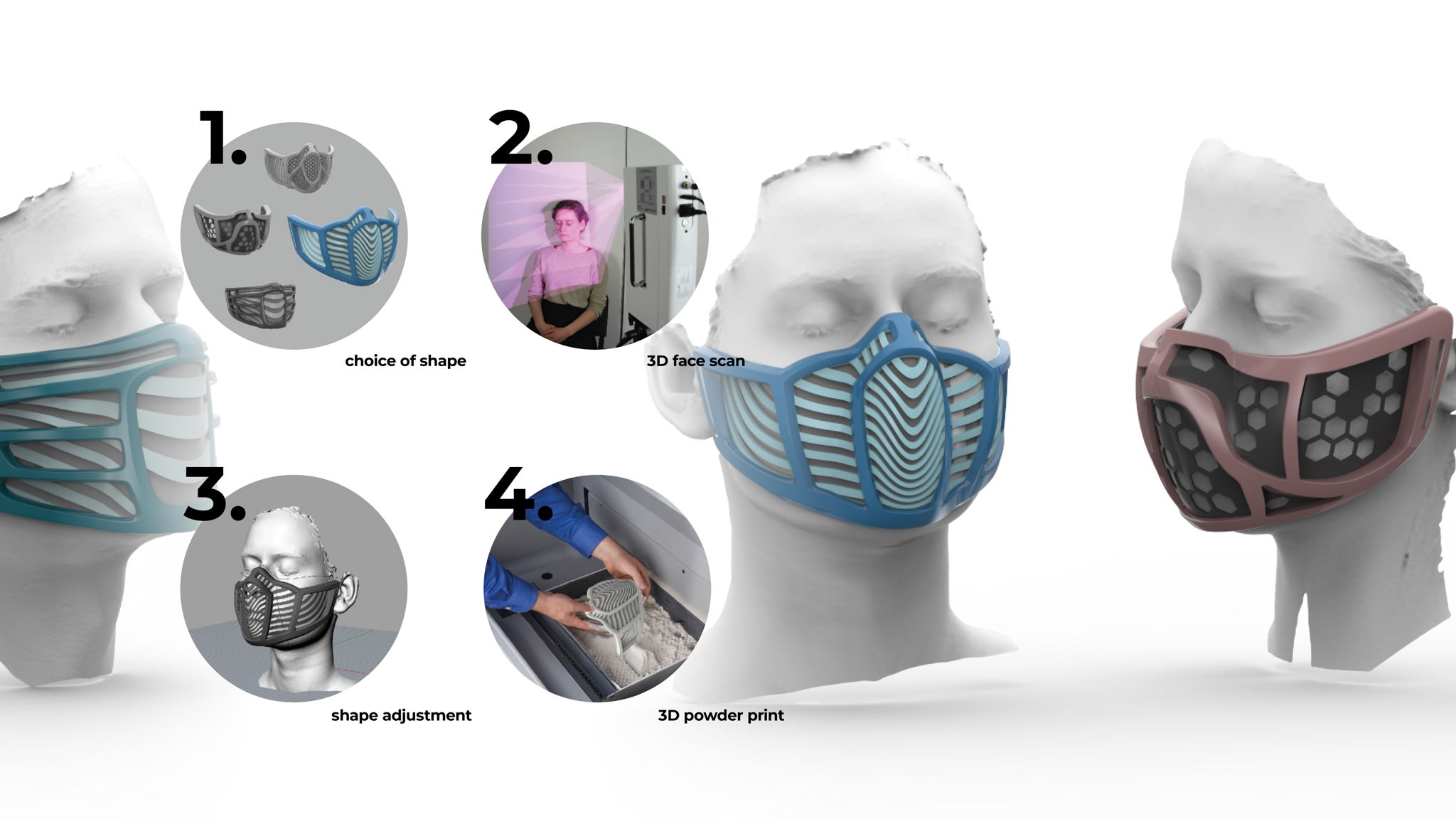 Project MASSQ is a vision of a new product, which is a fully personalised anti-pollution mask. Each model is individually tailored to the users face. Models are adjusted to the 3D scan of the face and then powder 3D-printed.