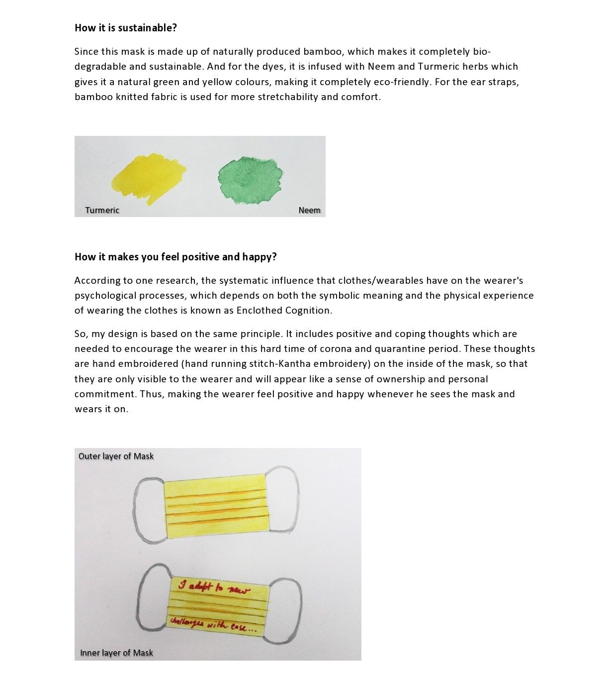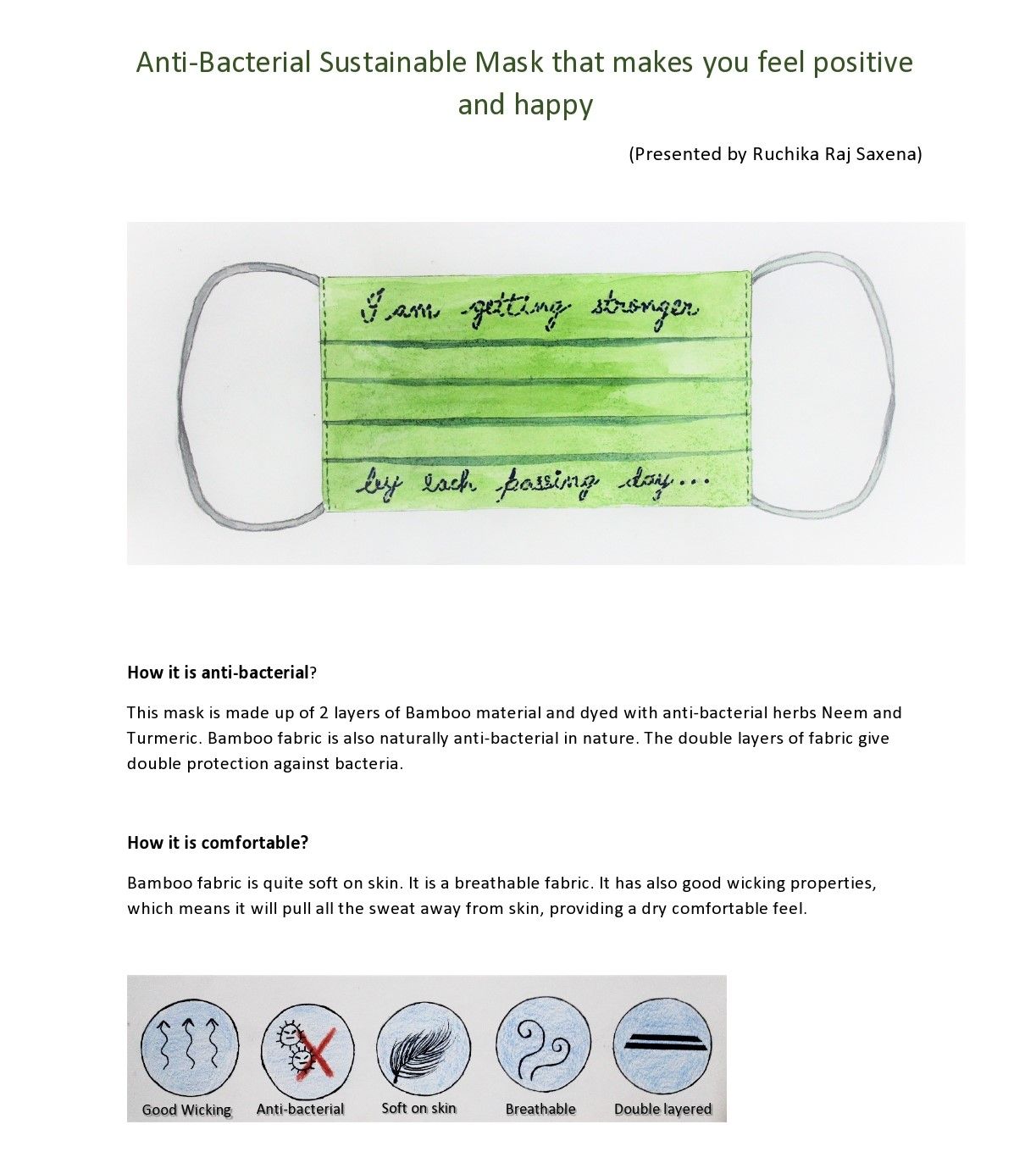 This mask is anti-bacterial, completely bio-degradable, sustainable, soft and comfortable to wear for longer periods, breathable and has high wicking properties for a sweat free experience. It helps the wearer to stay positive and happy.