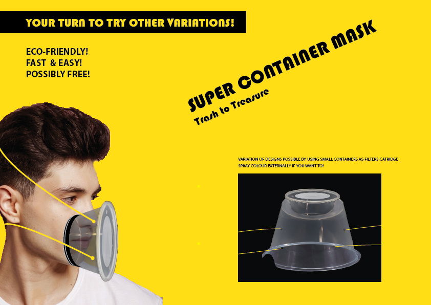 The key purpose of wearing a mask within the community is to prevent further spread of the virus e.g asymptomatic carrier to others, therefore the idea is to use simple things that we could find at home easily to build one basic mask that is sufficient to contain the virus & to prevent transmission to others when going out. One of the compiling items we have at home nowadays are take-out food containers, due to the need to stay at home the take-out containers has also been increase in usage creating much waste. The take out container structure is suitable to be used as a facemask with some minor modifications, without the need of 3D printing or manufacturing a new structure, thus we can speed up the process of having a basic mask and allow the healthcare professional to utilize professional masks.