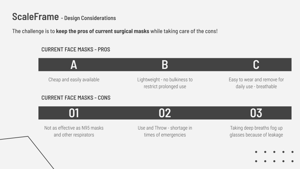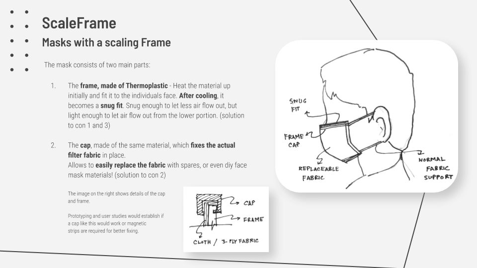ScaleFrame, standing for "Masks with a Scaling Frame", tries to solve the cons of current use-and-throw surgical masks used in our daily lives, while keeping the original benefits, which made the surgical mask viable in the first place.