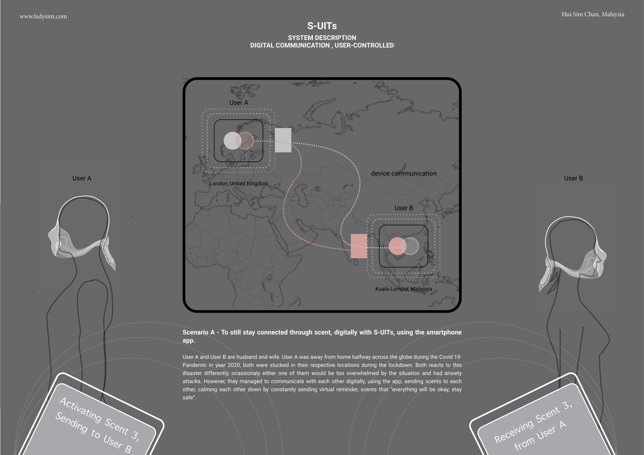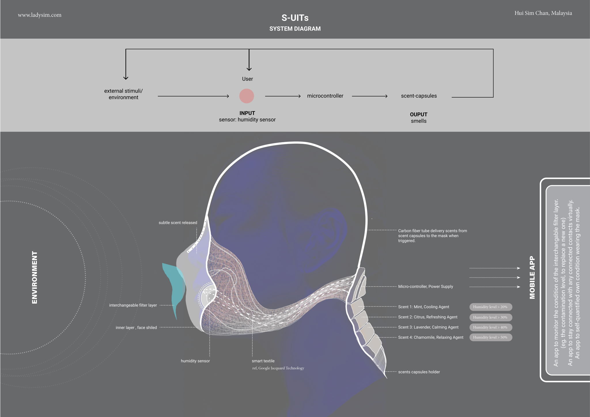 S-UITs is a future wearable device that is in the shape of a mask that not only serves as a protection from our immediate physical environment, but can also assist us to self-regulate our physiological condition by releasing specific scents to the wearer to support mental relaxation.