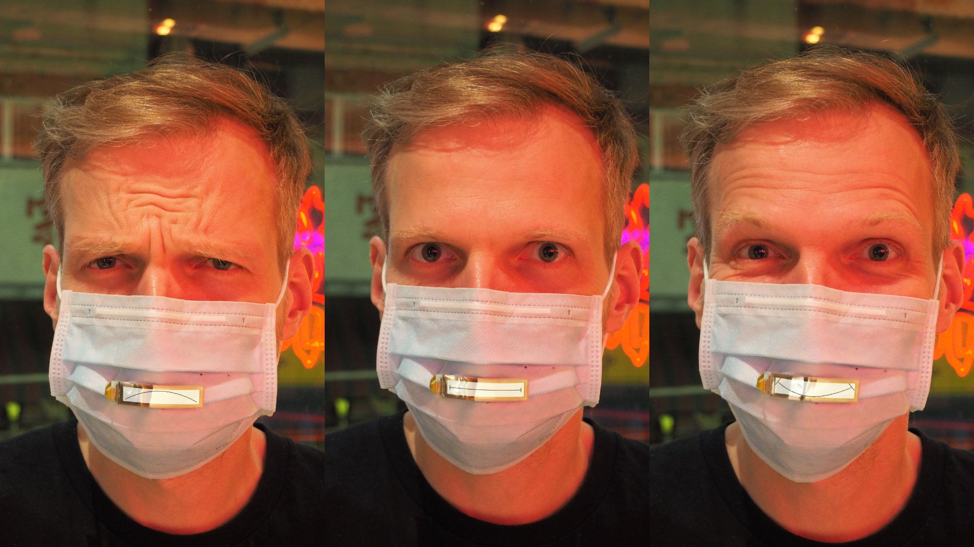 We went to 7-Eleven in Hong Kong. Felix had his phone pressed tightly into a sandwich box. He asked the clerk for help with removing the phone. Of course it was a joke, but the clerk could not tell from our facial expressions because we were wearing facemasks. The situation was embarrassing rather than funny. That’s why we created MojiMask, a mask that scans your mouth and visualizes your mood on a small display. The unit is reusable. It can be attached to standard off-the-shelf masks.