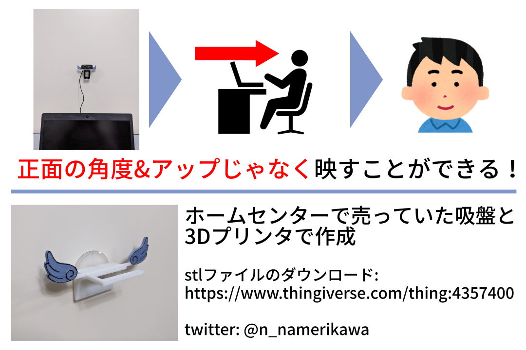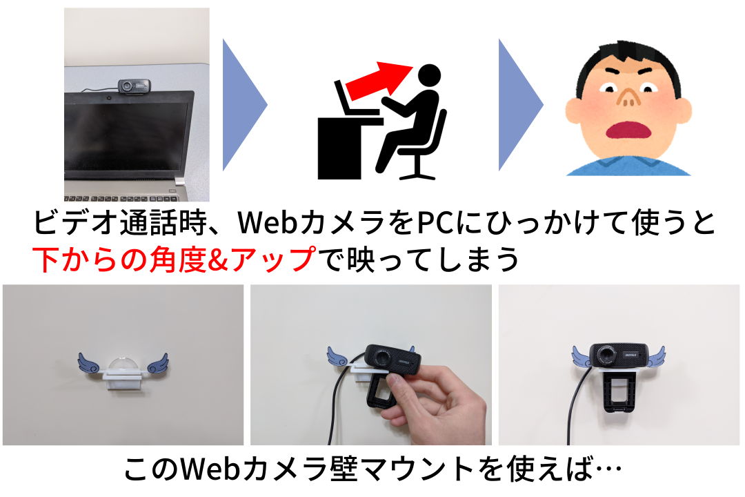 そこで私は、Webカメラを壁にくっつけることができる、Webカメラ壁マウントを自作しました。この壁マウントを使うことで、顔を正面から引きで映すことができるようになり、ビデオ通話での会議も気楽になります。